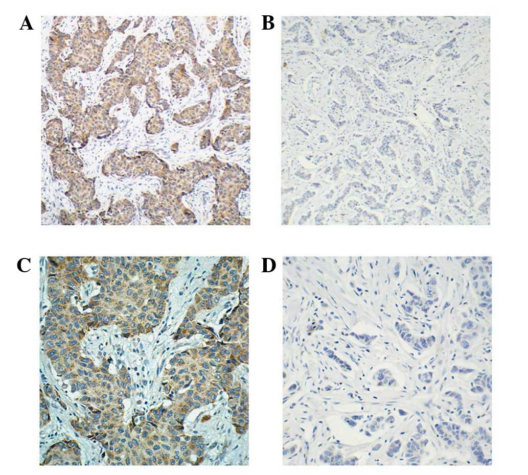 SIRT4 protein was examined in 409 breast cancer tissues and 241 paired adjacent non-tumor tissues. The cytoplasmic expression of SIRT4 was significantly higher in cancer tissues compared with adjacent non-cancerous tissues (P<0.0001). Among the 409 breast cancer specimens, 94 (22.98%) tissues exhibited positive SIRT4 expression and 315 (77.02%) tissues exhibited negative SIRT4 expression. Representative images of IHC SIRT4 staining are shown in Fig. 1. Of the 241 paired cancer and non-cancerous tissues, 48 (19.92%) breast cancer tissue samples were SIRT4 positive whereas only 29 (12.03%) adjacent non-cancerous tissue samples were SIRT4 positive (P<0.001).
