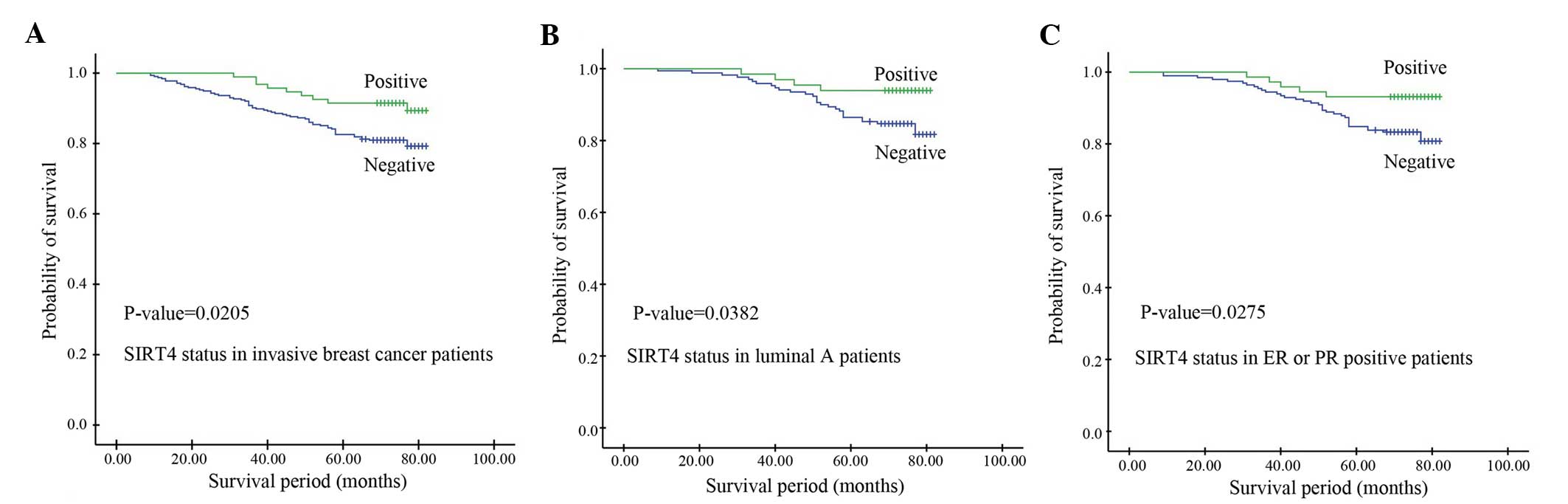 The present study demonstrated that negative SIRT4 protein expression was an independent predictor of a worse prognosis in invasive breast carcinoma. High SIRT4 expression levels were associated with a better OS in breast cancer patients. Based on the correlation between SIRT4 protein levels and the survival status in ER and PR-positive breast cancer patients, we postulate that low SIRT4 protein expression is Luminal A patients is a more effective anti-hormone therapy when used in combination with the glutamine metabolic inhibitor. Future study is required to determine the molecular mechanism by which SIRT4 regulates the progression of breast cancer.
