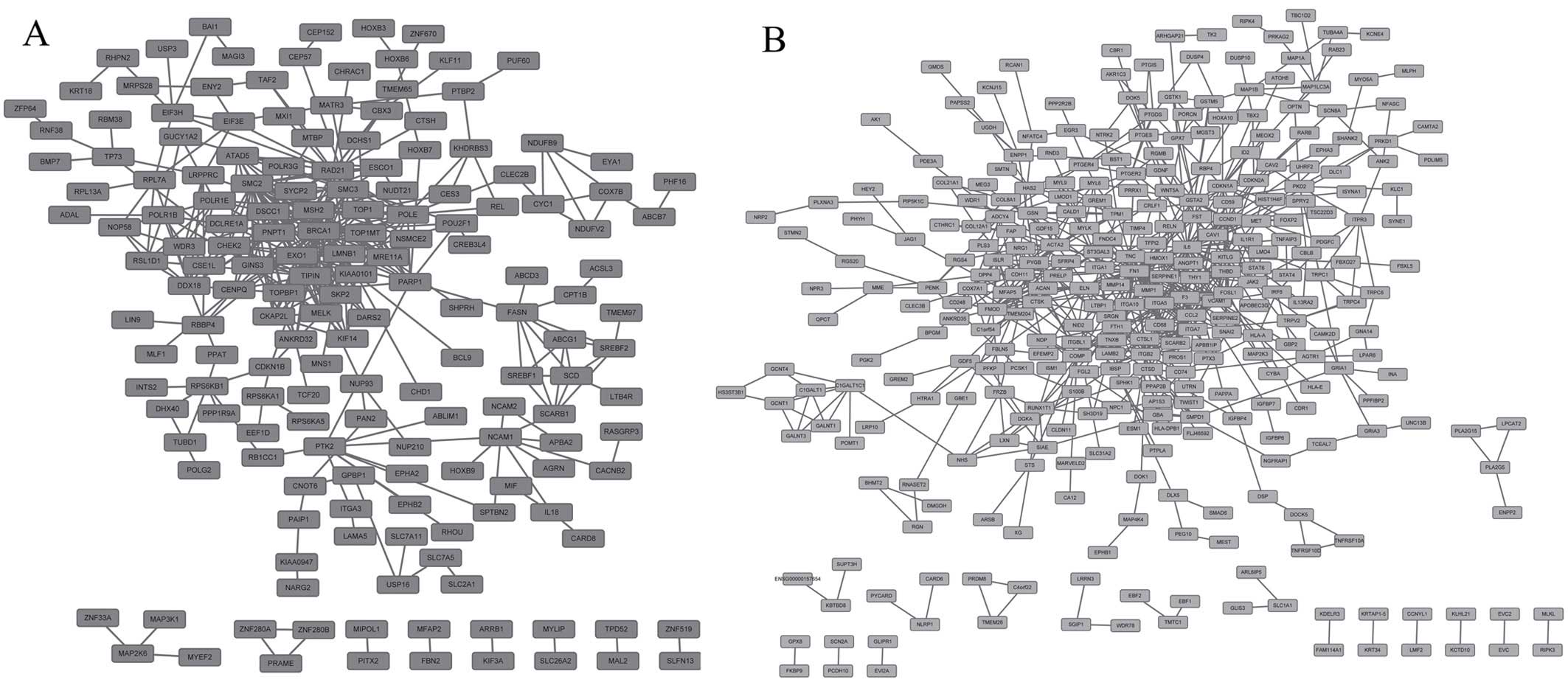 By submitting the upregulated and downregulated genes into STRING, respectively, we obtained PPIs associated with the DEGs. Fig. 1A demonstrates that the upregulated PPI network was constructed with 170 nodes and 362 edges. The nodes of breast-ovarian cancer gene 1 (BRCA1, degree=27) and melanocyte-stimulating hormone 2 (MSH2, degree=26) were hub proteins. Fig. 1B reveals that the downregulated PPI network was constructed with 332 nodes and 679 edges. Fibronectin 1 (FN1, degree=55), CCND1 (degree=18) and ITGA5 (degree=16) were hub proteins in the network.
