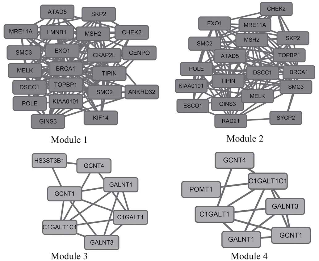 A total of 18 modules were identified in upregulated PPI network, among which the best one was module 1 (Fig. 2). Module 1 was composed of 21 nodes and 120 edges; P=2.771E-7. The hub proteins of BRCA1 (degree=20) and MSH2 (degree=14) were involved in module 1.