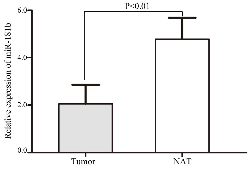 A total of 62 NSCLC tissues were included in this study. As shown in Fig. 1, miR-181b was significantly downregulated in the NSCLC tissues compared with the NATs (P=0.004). These results indicated that miR-181b may have a suppressive role in NSCLC.