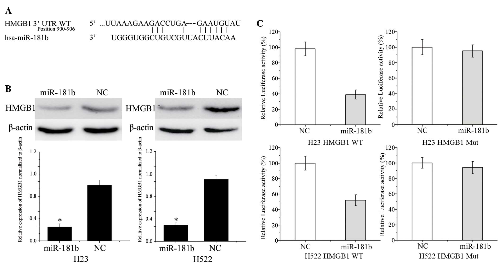 To determine whether HMGB1 is a direct target of miR-181b, luciferase reporter assays were performed. The luciferase reporter plasmids, pmirGLO-HMGB1–3′UTR wild-type (WT) and pmirGLO-HMGB1–3′UTR mutant (MUT), were synthesized and purified by GenePharma. The H23 and H522 cells were transfected with 0.5 µg reporter plasmid, 40 nmol miR-181b mimic or NC in a 12-well plate using Lipofectamine 2000 according to the manufacturer's instructions. At 48 h post-transfection, the activities of the firefly and renilla luciferases were determined with the Dual-Luciferase Reporter Assay System (Promega, Manheim, Germany). Each assay was replicated 3 times. The firefly luciferase activity was normalized to the renilla luciferase activity for each transfected well.