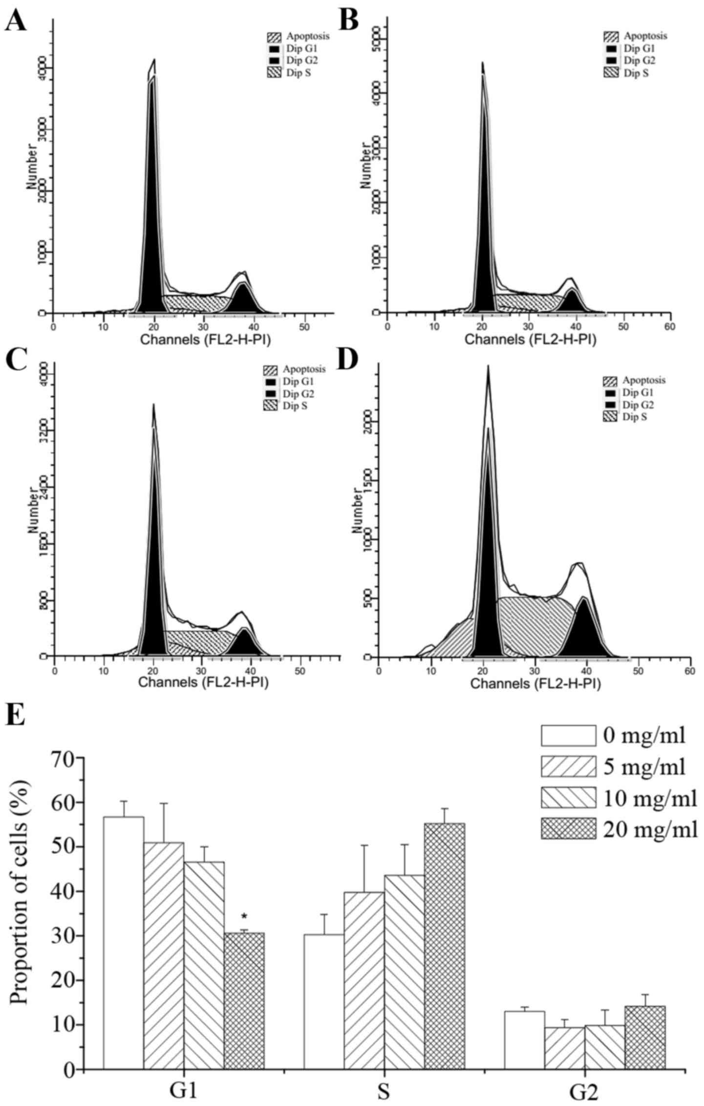 PI staining was used to detect the effects of corn silk extract at various concentrations on colon cancer cells. Forty-eight hours after treatment, a sub-diploid peak was present in the left part of the graph. With the increase in corn silk extract concentration, the sub-diploid peak became increasingly evident, representing a gradient of mortality. As shown in Fig. 2A to D, the sub-G1 fractions in the corn silk extract-treated groups were 7.86, 12.93 and 16.44%, which was significantly higher than the 4.71% of the negative control group. These results reveal that corn silk extract has a significant inhibitory effect on cancer cell growth. Moreover, the sub-G1 fraction was increased in a drug concentration-dependent manner. As shown in Fig. 2E, flow cytometry revealed that the percentage of cells in the G1 phase was 56.56, 50.92, 46.57 and 30.62% following treatment with 0, 5, 10 and 20 mg/ml corn silk extract, respectively, for 48 h. The number of S-phase cells was 30.28, 39.72, 43.57 and 55.21% with 0, 5, 10 and 20 mg/ml corn silk extract for 48 h. The data revealed that the relative proportion of cells in the S phase increased when the concentration of corn silk extract was increased. Experiments revealed that the corn silk extract inhibited the proliferation of cells mainly through S-phase arrest, blocking cells from entering the G2/M phase of mitosis. Correspondingly, cells in the sub-G1 phase were also increased in a drug concentration-dependent manner, which was consistent with the flow cytometry data. Therefore, the cell cycle inhibitory effect of the corn silk extract mainly involved S-phase arrest.