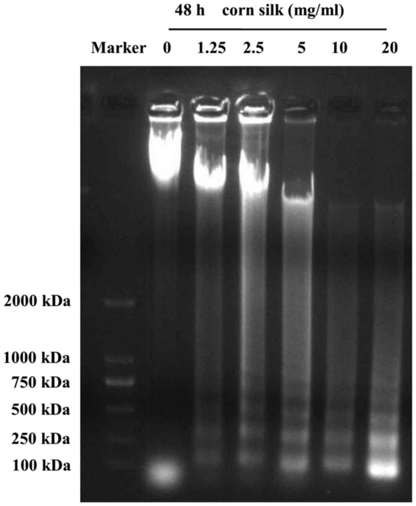 LoVo cells were seeded in a six-well plate at a density of 5×105 cells/well, incubated with various concentrations (1.25, 2.5, 5.0, 10.0 and 20.0 mg/ml) of corn silk extract for 24, 48 and 72 h, and then harvested. The cells were lysed in a cell lysis buffer (10 µmol/ml Tris-HCl, 10 µmol/ml EDTA, 0.5% Triton X-100) at 4°C for 4 min. Following centrifugation, the supernatant was treated with RNase A (20 mg/ml) and proteinase K (20 mg/ml) for 30 min at 37°C. Then, DNA was extracted by NaCl-isopropanol (1:6) at −20°C overnight. The extracted DNA was resuspended and loaded in each well, and DNA gel electrophoresis was performed using 1.5% agarose gel. Following ethidium bromide staining, images of the DNA ladders were captured under UV as previously described (14).