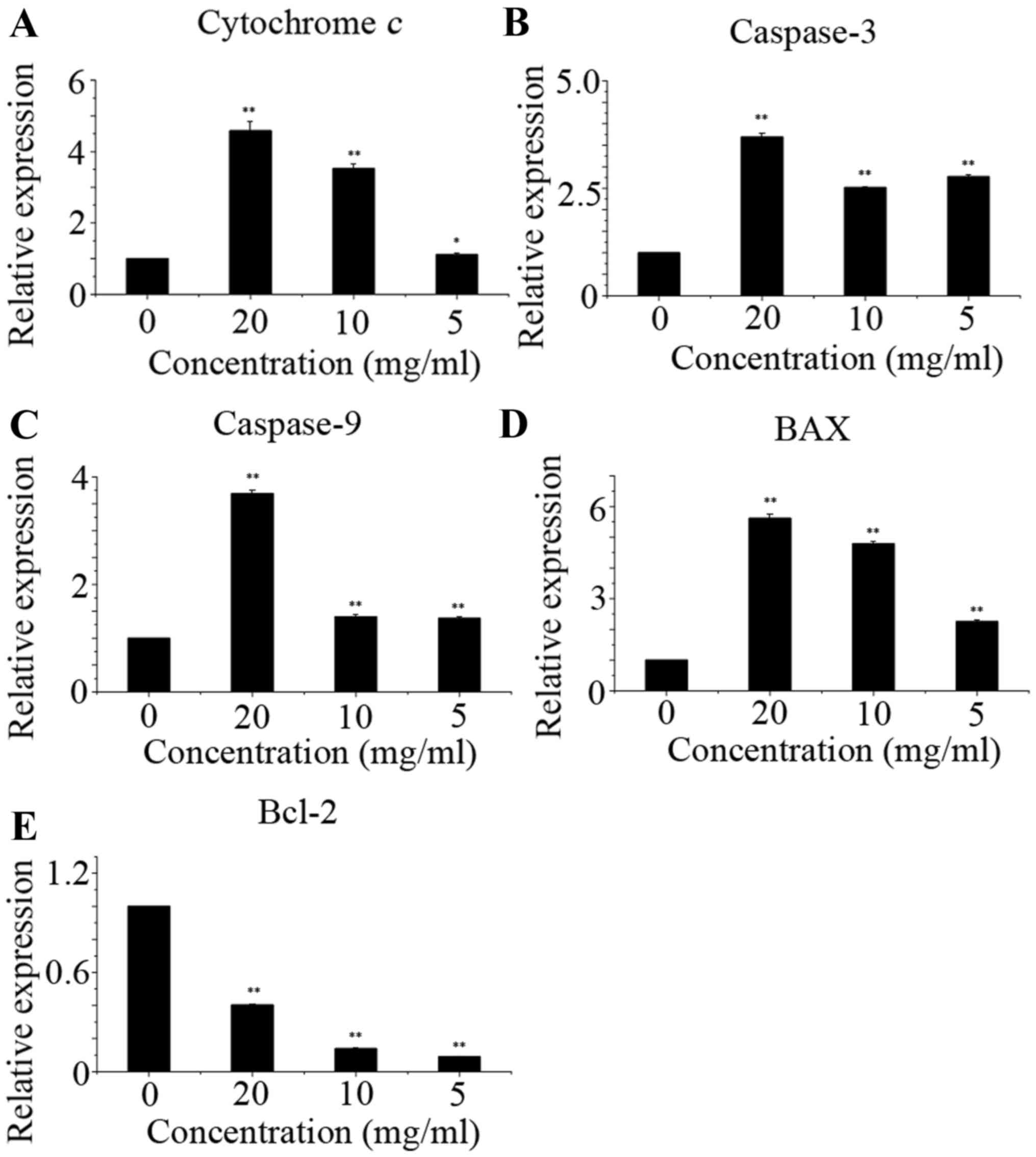 As shown in Fig. 5, corn silk extract upregulated the levels of cytochrome c, caspase-3, caspase-9 and Bax, but reduced the levels of Bcl-2, which led to apoptosis. Western blot analysis data are presented as the relative expression of selected proteins compared with GAPDH (Fig. 6). Using western blot assay, we have shown above that apoptotic pathway induction by corn silk extract treatment was mediated by affecting the Bax and Bcl-2 levels, causing dysfunction of mitochondria, promoting the release of cytochrome c and activating caspase-9 and caspase-3 (15,25).