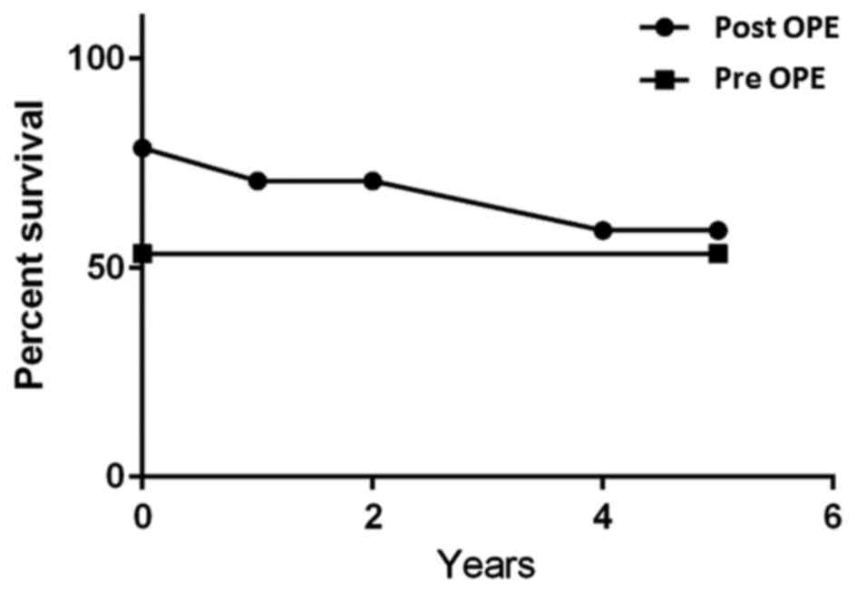 Data were analyzed using SPSS v22.0 (IBM SPSS, Armonk, NY, USA). Survival time was calculated using the Kaplan-Meier product limit estimate method. Variables were compared between groups using T-scores and the χ2 test. P<0.05 was considered to indicate a statistically significant difference.
