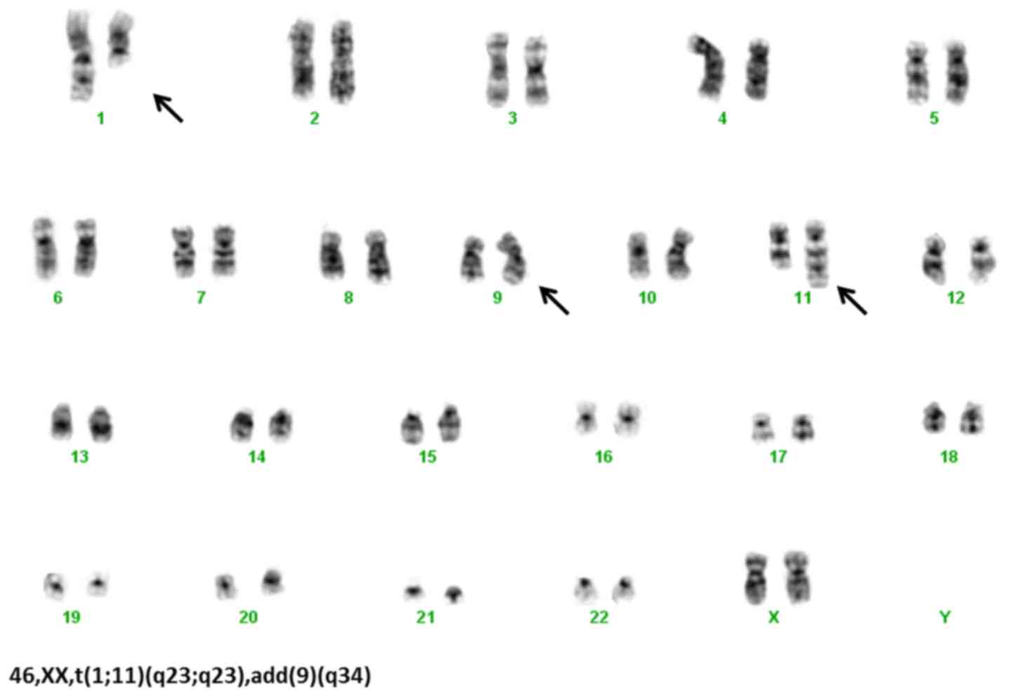 Li L, Ritterbach J, Harbott J, Schroyens W, Lohmeyer J, Pralle H and Lampert F: Blastic phase chronic myeloid leukemia with a four-break rearrangement: t(11;9)(9;22)(q23;p22;q34;q11). Cancer Genet Cytogenet. 68:131–134. 1993. View Article : Google Scholar : PubMed/NCBI | |