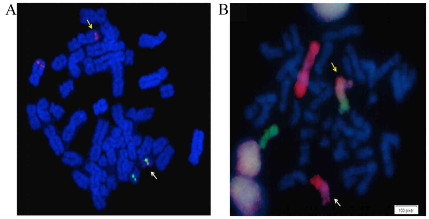 Finally, to determine if the cryptic Ph chromosome was the result of a variant translocation, involving chromosomes 1, 9, 11 and 22, a whole chromosome painting (WCP) of chromosomes 1 and 11 was performed (WCP LIVe Probes; Lexel), as previously described (10). The results indicated that the t(1;11)(q21;q23) translocation and cryptic Ph chromosome had an independent origin (Fig. 2B). The FISH analysis could not determine the nature of the extra material in add(9q).