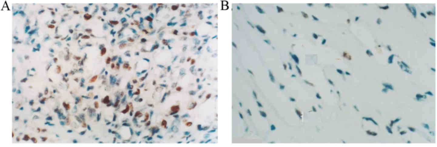 Cells were considered PCNA-positive if brown-yellow granules were distributed diffusely in the nuclei of endothelial cells. In proliferative hemangioma tissue samples, the nuclei of endothelial cells were large and PCNA expression was high (Fig. 2A). In the involuting hemangioma tissue samples, the nuclei of endothelial cells were flat, there were few nuclei and nuclei contained a small amount of brown-yellow granules, indicating that PCNA expression was low (Fig. 2B).