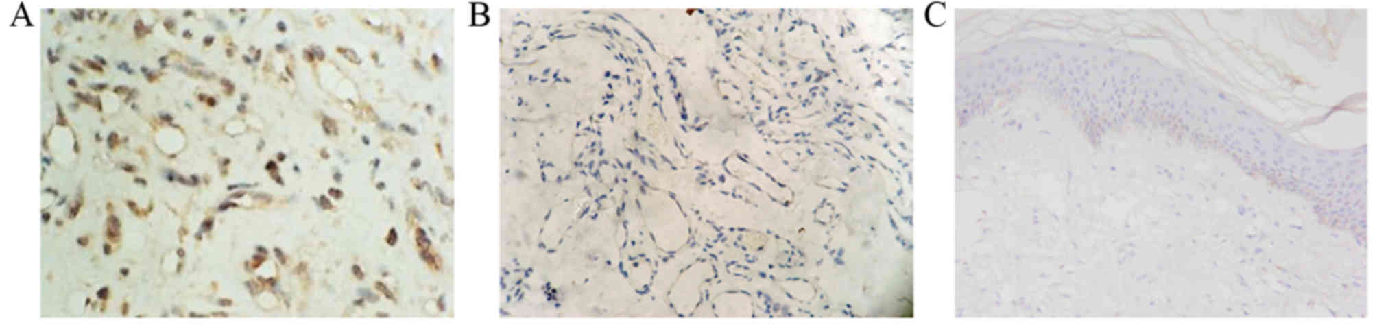 Brown-yellow granules were observed in the endochylema of endothelial cells in proliferative hemangioma tissue, indicating that p53 expression was high (Fig. 4A). No brown-yellow granules were identified in the endochylema of endothelial cells in involuting hemangioma tissue samples (Fig. 4B) or healthy skin tissue samples, revealing weak or no p53 expression (Fig. 4C), suggesting little or no p53 expression.