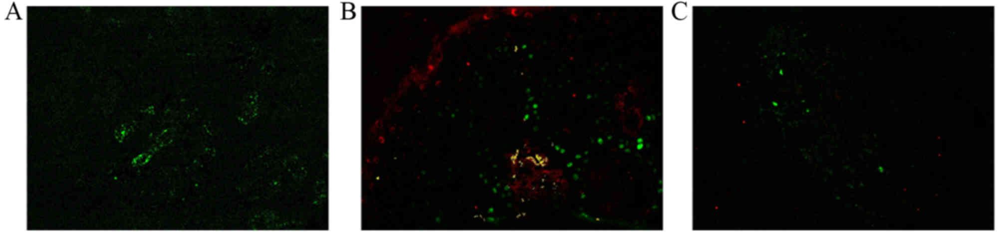 The presence of PCNA was visible as green fluorescence, and the presence of Bcl-2 was visible as red fluorescence (Fig. 5). No Bcl-2 expression was identified in the vascular tissue cells of healthy skin specimens (Fig. 5A). Bcl-2 was highly expressed in the endochylema and cytomembrane of cells in proliferative hemangioma tissue samples (Fig. 5B). Conversely, Bcl-2 and p53 expression was low in the endochylema and cytomembrane of cells in involuting hemangioma tissue samples (Fig. 5C).