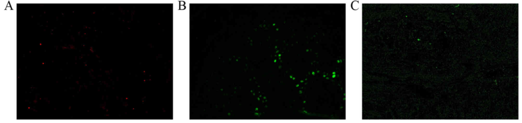 The Ready-to-use anti-human mouse monoclonal antibody directed against proliferating cell nuclear antigen (PCNA), ready-to-use Ultra-Sensitive Immunohistochemical Streptavidin-Peroxidase (S-P) kit, ready-to-use mouse anti-human monoclonal antibody directed against p53, DAB Color Developing Reagent kit and poly-lysine were purchased from Beijing Zhongshan Golden Bridge Biotechnology Co., Ltd. (OriGene Technologies, Inc., Beijing, China). Mouse anti-human monoclonal antibody directed against Bcl-2 was purchased from Santa Cruz Biotechnology, Inc. (Dallas, TX, USA). The Quantum Dot Immunofluorescent Double-Staining Reagent kit was purchased from Wuhan Jiayuan Quantum Dot Technological Development Co., Ltd. (Wuhan, China; cat no. K-3001-3) and diethylpyrocarbonate was purchased from Gibco (Thermo Fisher Scientific, Inc., Waltham, MA, USA).