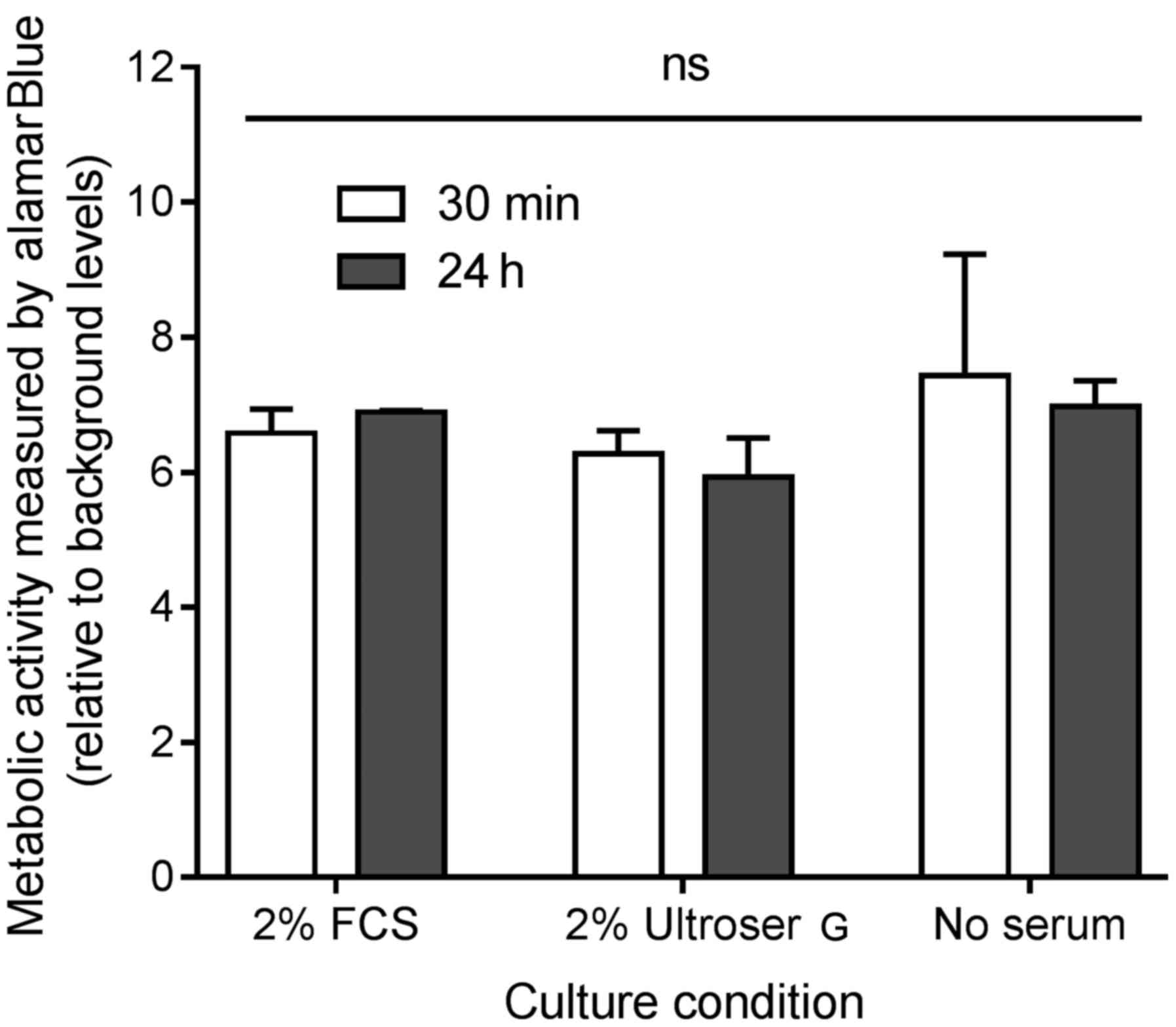 The metabolic activity, as a measurement of viability, was assessed by addition of alamarBlue® for 3 h to the ex vivo cultures after 30 min and 24 h of primary culture. A total of three different culture conditions were investigated: Growth medium with 2% FCS, growth medium with 2% Ultroser® G and growth without FCS or Ultroser® G. The results are shown in Fig. 2. No significant difference was detected in the viability after 30 min or 24 h, indicating that the ex vivo cultures stay viable for ≤24 h of culture. In addition, no difference was detected when comparing the three culture conditions, suggesting that the effect of either 2% FCS or 2% Ultroser® G on cell viability in the ex vivo cultures is of no importance for the conditions of the present study.