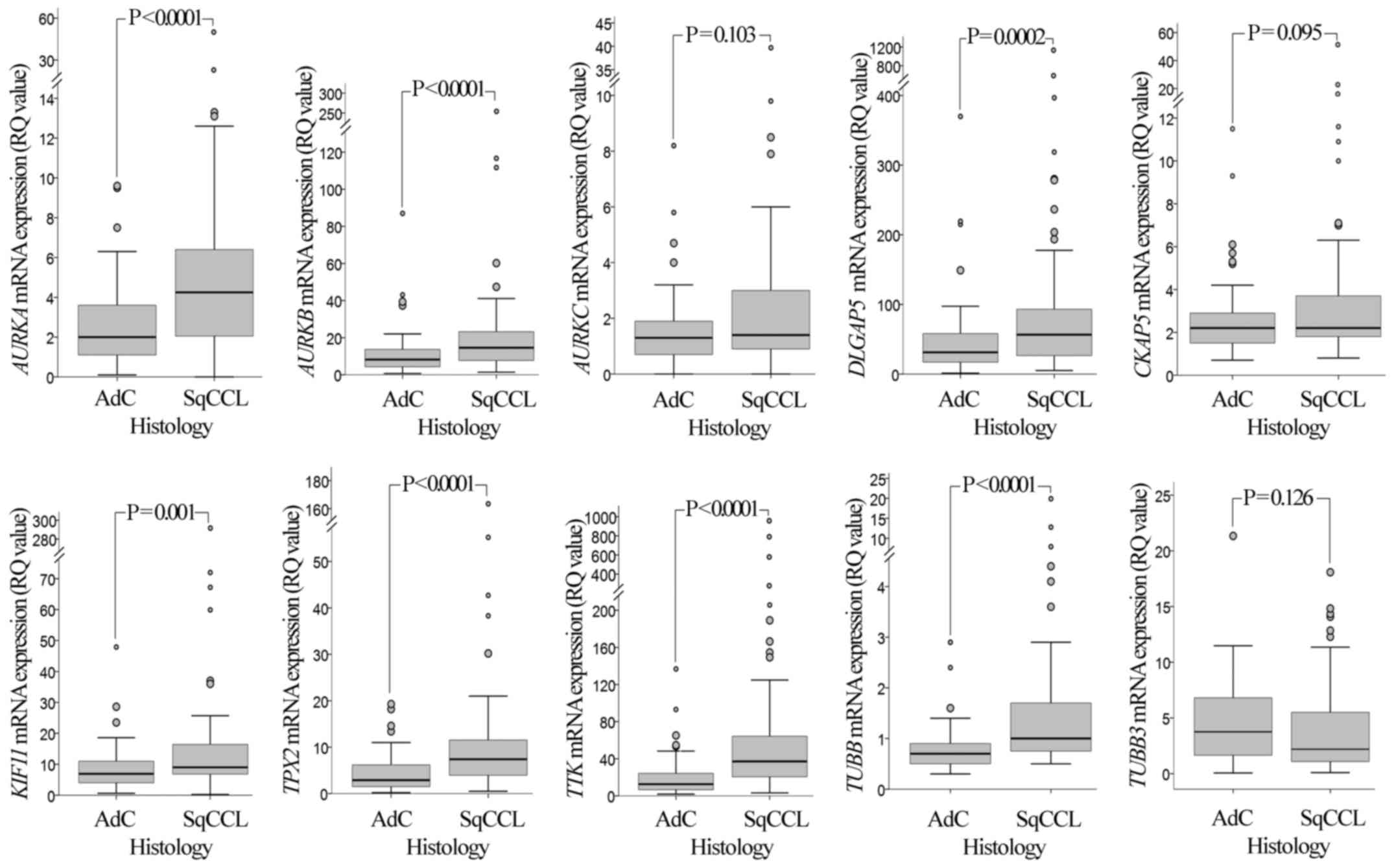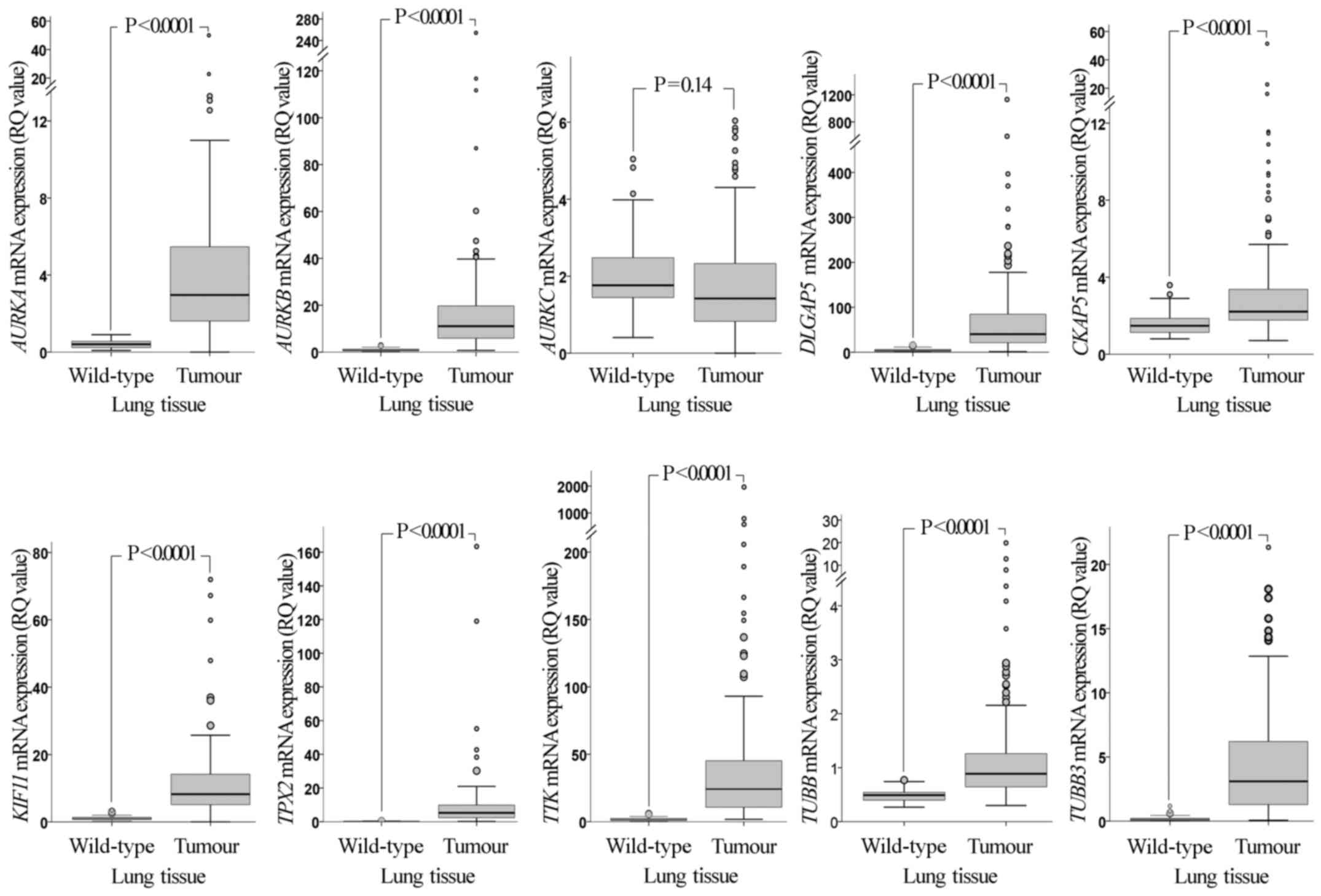 Total RNA was extracted from primary lung tumour tissue (ten 20-µm thick sections per specimen) using a Direct-zol™ RNA MiniPrep kit (Zymo Research Corp., Irvine, CA, USA), according to the manufacturer's protocol. The quality and quantity of RNA were determined using a NanoDrop 2000 spectrophotometer (Thermo Fisher Scientific, Inc., Wilmington, DE, USA) and 200 ng RNA was reverse transcribed using a High-Capacity cDNA Reverse Transcription kit (Thermo Fisher Scientific, Inc., Waltham, MA, USA), according to the manufacturer's protocol. Predesigned 6-carboxyfluorescein-labelled TaqMan Gene Expression Assays (Thermo Fisher Scientific, Inc.) were employed, according to the manufacturer's protocol, to analyse mRNA expression: AURKA, Hs01582072_m1; AURKB, Hs00945858_g1; AURKC, Hs00152930_m1; CKAP5, Hs01120723_m1; DLGAP5, Hs00207323_m1, KIF11, Hs00189698_m1; TPX2, Hs00201616_m1; TTK, Hs01009870_m1; TUBB, Hs00962419_g1; and TUBB3, Hs00964962_g1, with a 4,7,2′-trichloro-7′-phenyl-6-carboxyfluorescein-labelled β-actin (ACTB) TaqMan Gene Expression Assay (cat. no. 4326315E; Thermo Fisher Scientific, Inc.) serving as an endogenous control. RNA from human bronchial epithelial cells (HBEC-3KT) was used as technical calibrator. Three technical replicates were performed for every qPCR assay. Thermocycling conditions were 95°C for 10 min (activation), 45 cycles of 95°C for 15 sec (denaturation), 60°C for 1 min (annealing and extension)] on a Life Technologies StepOnePlus Real-Time PCR System. mRNA levels were expressed as relative quantification (RQ) values, which were calculated as RQ=2−ΔΔCq (24). Quantification cycle (Cq) values were determined using StepOne software (version 1.2; Thermo Fisher Scientific, Inc.) and normalised to the corresponding Cq value for the endogenous control ACTB, generating ΔCq values (ΔCq=Cq target-Cq ACTB). Sample ΔCq values were further normalised against an immortalised bronchial epithelial cell line HBEC-3KT (23) calibrator using the formula: ΔΔCq=(ΔCq sample-ΔCq HBEC-3KT).
