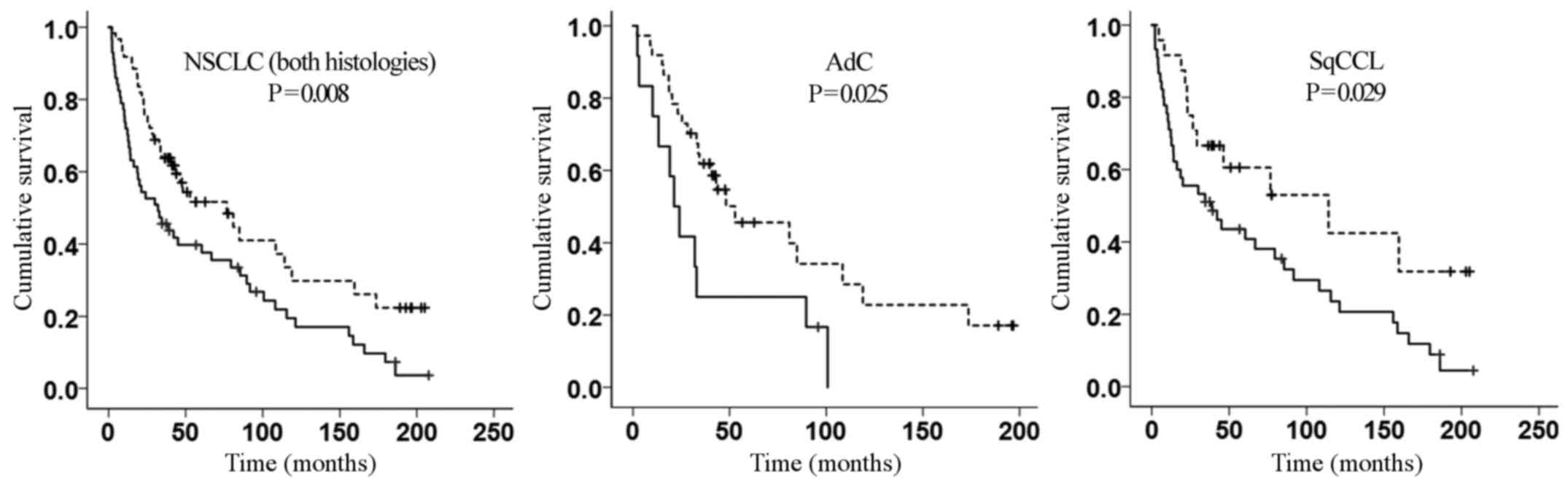 There was no association between the mRNA expression of any of the genes evaluated with age, sex, pathological stage or nodal status (Table I). Potential associations between the expression level of the target genes and overall survival rate were examined. In univariate analysis, pathological stage, nodal status and AURKA mRNA expression were predictors of overall survival rate (Table II). Most importantly, multivariate analysis demonstrated that AURKA mRNA expression [hazard ratio (HR), 1.81; 95% confidence interval (CI) 1.16–2.84; P=0.009] independently predicts poor prognosis in patients with NSCLC upon adjusting for age, pT2 and involvement of distal nodes (pathological node stage 2) (Table II). This observation was consistent with the Kaplan-Meier estimator curve (Fig. 3). The association with prognosis remained significant even when SqCCL and AdC tissues were tested separately (P=0.025 and P=0.029, respectively; Fig. 3).