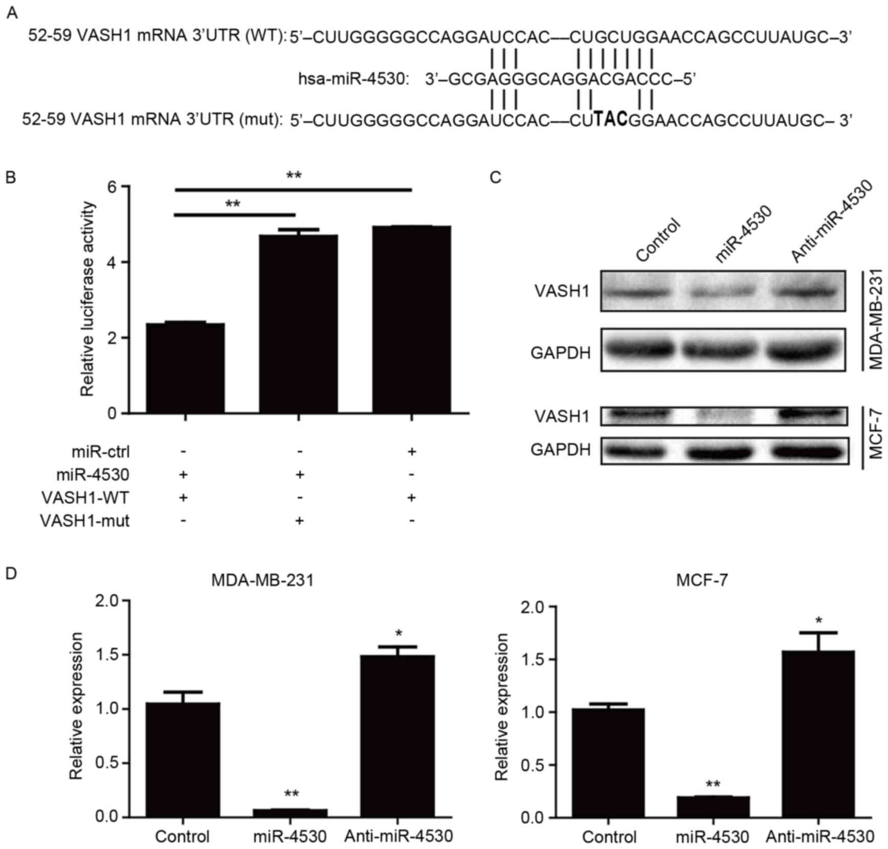 To the best of our knowledge, the present study is the first to investigate the association between VASH1 and miR-4530, and determine the biological characteristics of VASH1 in human breast carcinoma cells. The results of the present study suggest that VASH1 and miR-4530 are potential therapeutic targets for the treatment of breast cancer particularly with regard to antiangiogenesis therapy.