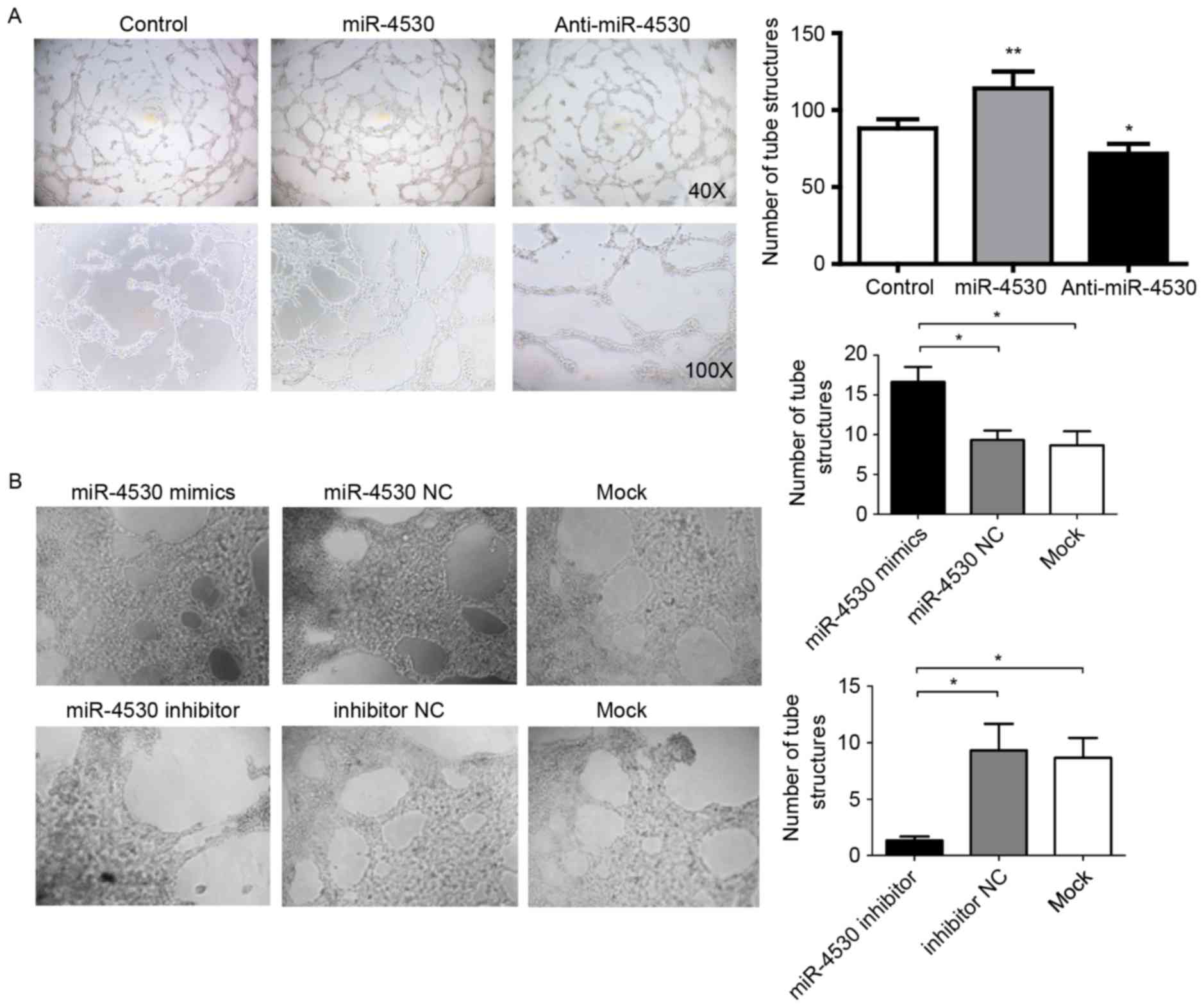 As expected, the TCM from the anti-miR-4530 group significantly suppressed HUVECs from forming tube structures compared with the control group (Fig. 3A). In addition, tube formation assays were performed on HUVECs transfected with miRNA-4530 mimics, inhibitors or their negative controls. The results were similar to previous results, whereby the mimics significantly increased and the inhibitor significantly decreased the number of tube structures formed compared with the mock-transfected control group (Fig. 3B). It was revealed that miR-4530 mimic-transfected HUVECs exhibited a significant increase in their capability to form tube structures in vitro on Matrigel (Fig. 3B), with a 50% increase in tube structures compared with miR-4530 NC- or mock-transfected HUVECs. The HUVECs transfected with the miR-4530 inhibitors exhibited significant suppression of angiogenesis in vitro, with a 75% decrease in tube structures on Matrigel compared with miR-4530 inhibitors NC- or mock-transfected HUVECs (Fig. 3B).
