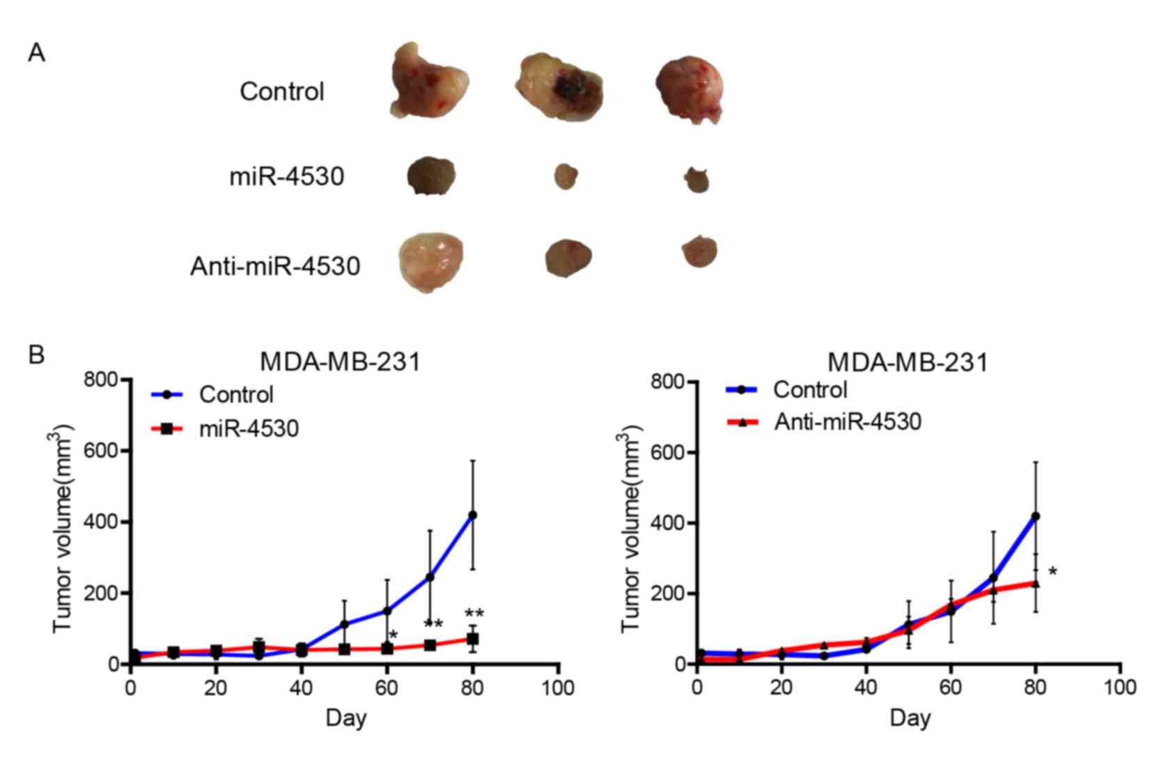 The nude mice xenograft model was applied to further investigate the effect of miR-4530 on tumorigenicity. MDA-MB-231 cells stably transfected with the miR-4530 precursor, anti-miR-4530 or empty plasmids were subcutaneously injected into 2-month-old female nude mice and the tumor volume was monitored for evaluating the effect of miR-4530 on tumor growth. As presented in Fig. 4A, stable transfection of miR-4530 precursor into MDA-MB-231 cells resulted in a decreased growth rate and significantly decreased tumor size of subcutaneous xenograft tumors by day 60 in nude mice, when compared with the control group (Fig. 4B). Furthermore, cells transfected with anti-miR-4530 exhibited a significant decrease in tumor size by day 80 compared with the control group. The miR-4530 precursor group demonstrated a larger decrease in tumor volume compared with the anti-miR-4530 group. Therefore, cells stably transfected with the miR-4530 precursor exhibited poor survival rates and low tumorigenicity. These results indicate that upregulation of miR-4530 expression is disadvantageous for tumorigenicity.
