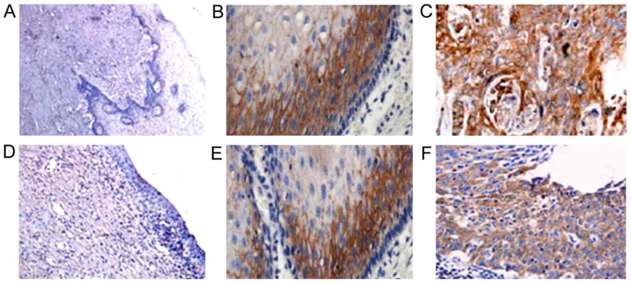 Seventy cervical cancer patients who initially received surgical treatments and had completely preserved clinical and pathological data, in the Department of Obstetrics and Gynecology, Xuzhou Central Hospital from May 2008 to June 2010, were selected to participate in the study. Inclusion criteria included: i) A definite pathological diagnosis; ii) clinical data were complete; iii) no radiotherapy or chemotherapy had been performed before operation; and iv) there were no brain, liver, kidney or other organ dysfunctions. The age of the patients ranged from 22 to 74 years with an average of 42.6±13.2 years. There were 59 cases of squamous cell carcinoma and 11 cases of adenocarcinoma. Classification according to the FIGO standards (4) placed 28 cases in the low degree (I and II classification), and 42 in the high degree (III and IV classification). Also, based on pathological differentiation, there were 8 patients with high differentiation, 25 with moderate differentiation, and 37 with poor differentiation, and 47 patients had lymph node metastasis, and 23 did not have any. Tissues 2 cm away from the tumor border were used for the paracancerous tissue group, and 20 cases of normal cervical tissue, from accessory resections were taken for the control group. Comparing the average ages of the control and the cervical cancer groups, the difference was not statistically significant (P>0.05), indicating that the division in both groups could be used for other comparisons. All subjects signed written informed consents and the Ethics Committee of Xuzhou Central Hospital approved the study. The 70 cervical cancer patients were followed-up; the last day of the follow-up was July 1, 2015, and the average follow-up time was 52.1 months.