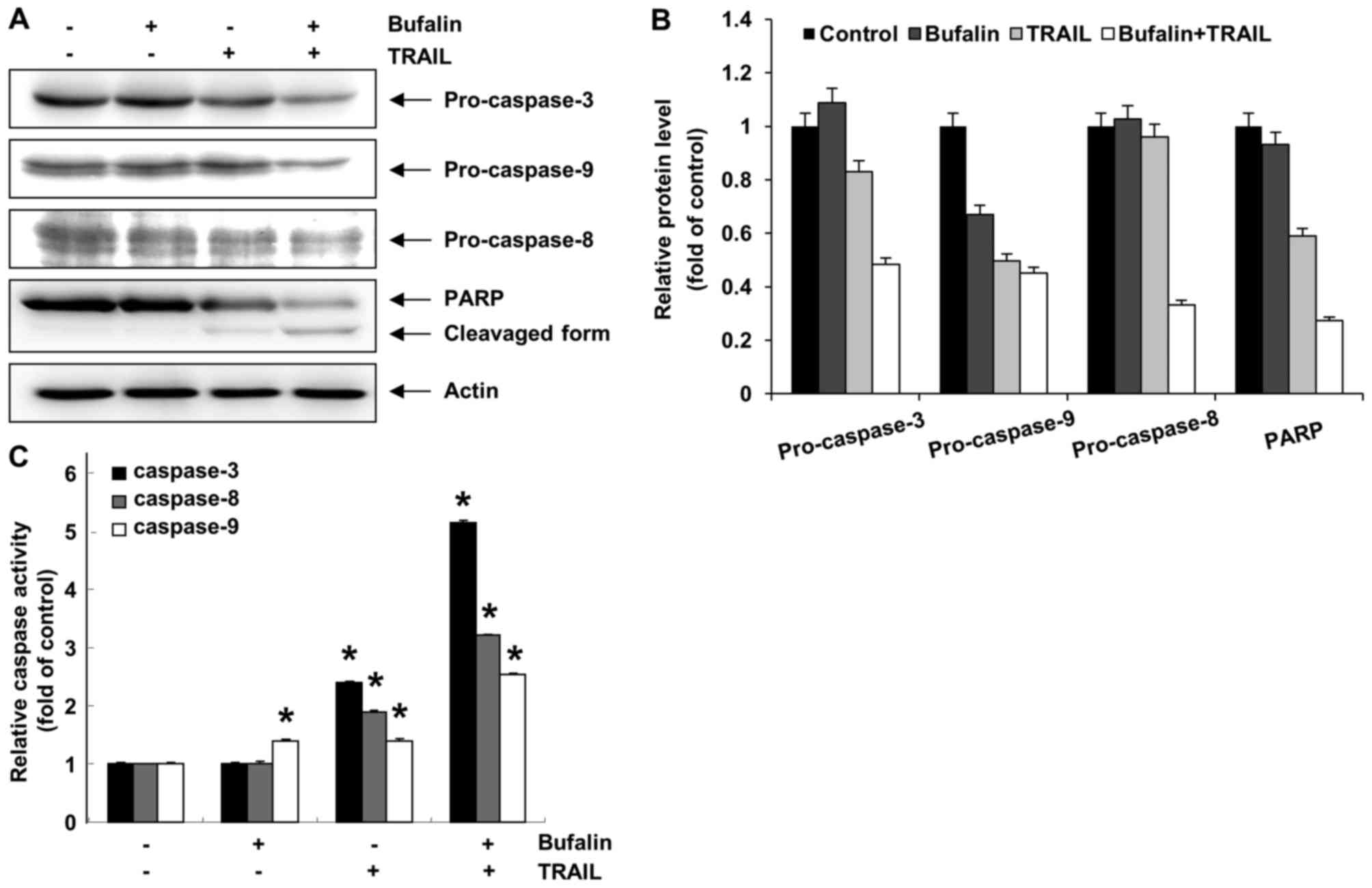 Effects of combined bufalin and TRAIL treatment on the activation of caspase and the cleavage of PARP. (A) T24 cells were incubated with bufalin (10 nM), TRAIL (50 ng/ml), or a combination of both for 24 h, and caspase and PARP levels were determined using western blot. (B) Relative levels of the indicated proteins. (C) Activity of caspase-3, −8 and −9 was determined using a caspase assay kit in T24 cells. The data are expressed as the mean ± standard deviation of three independent experiments. The significance was determined using the Student's t-test. *P<0.05 vs. untreated control. TRAIL, tumor necrosis factor-related apoptosis-inducing ligand; PARP, poly (ADP-ribose) polymerase.