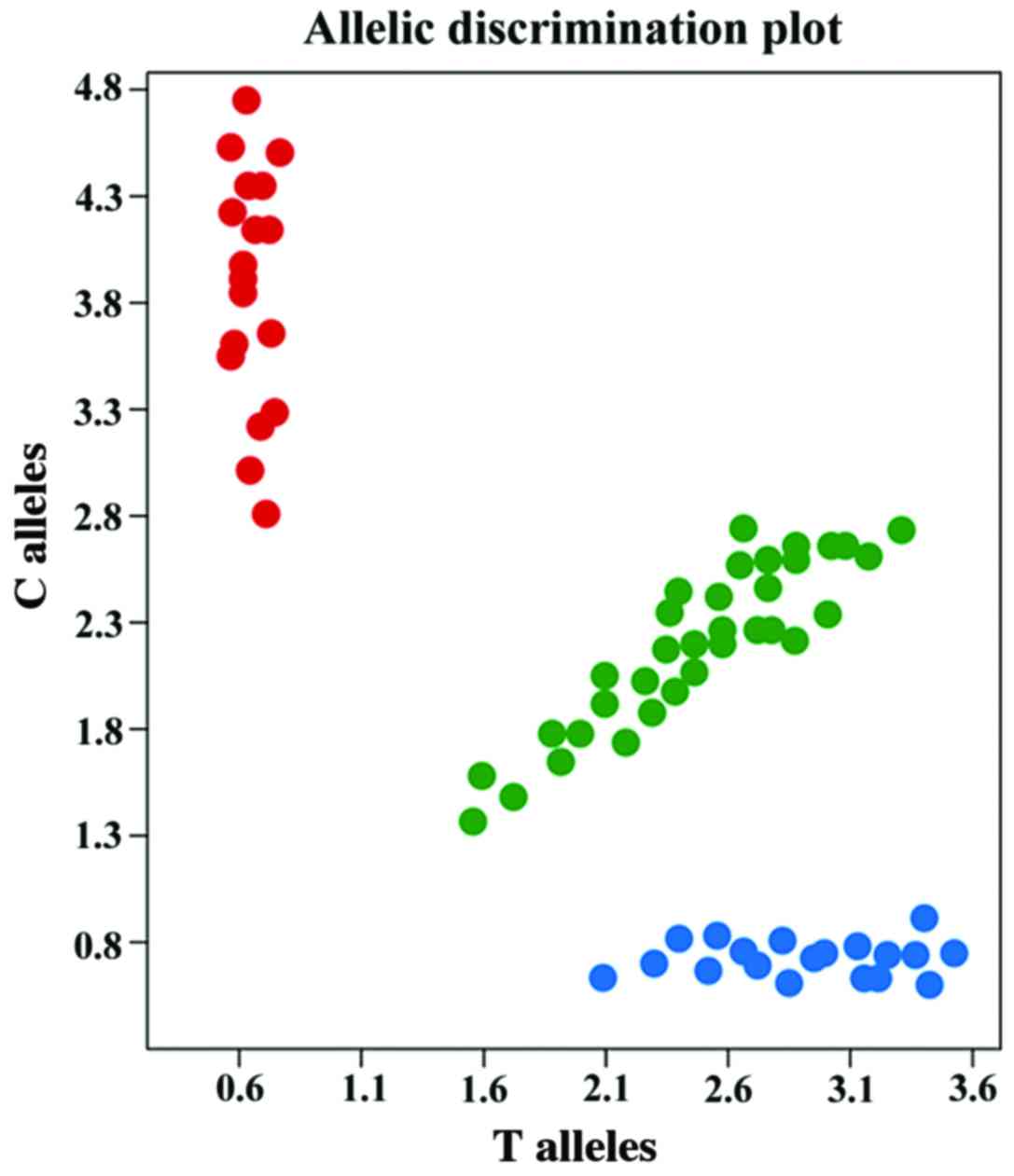 The genotypes of the TERT rs2736098 and CLPTM1L rs401681 loci are shown in Fig. 1. The vertical coordinates represent the C alleles, and the horizontal coordinates represent the T alleles.