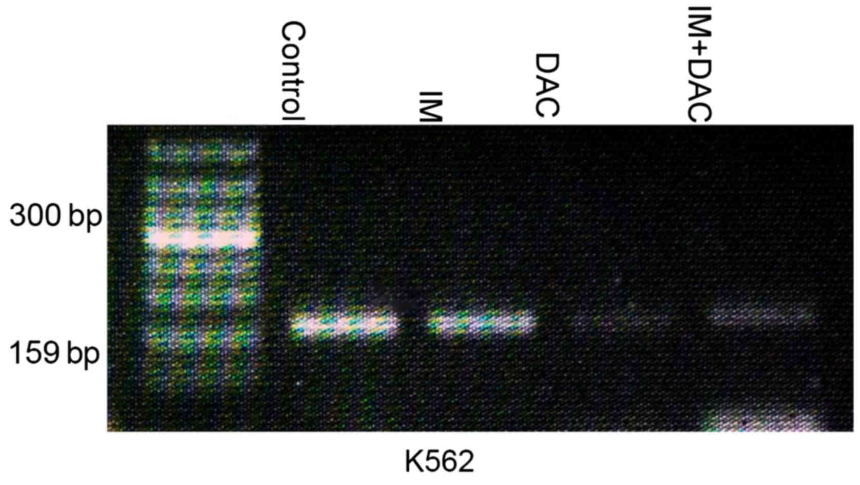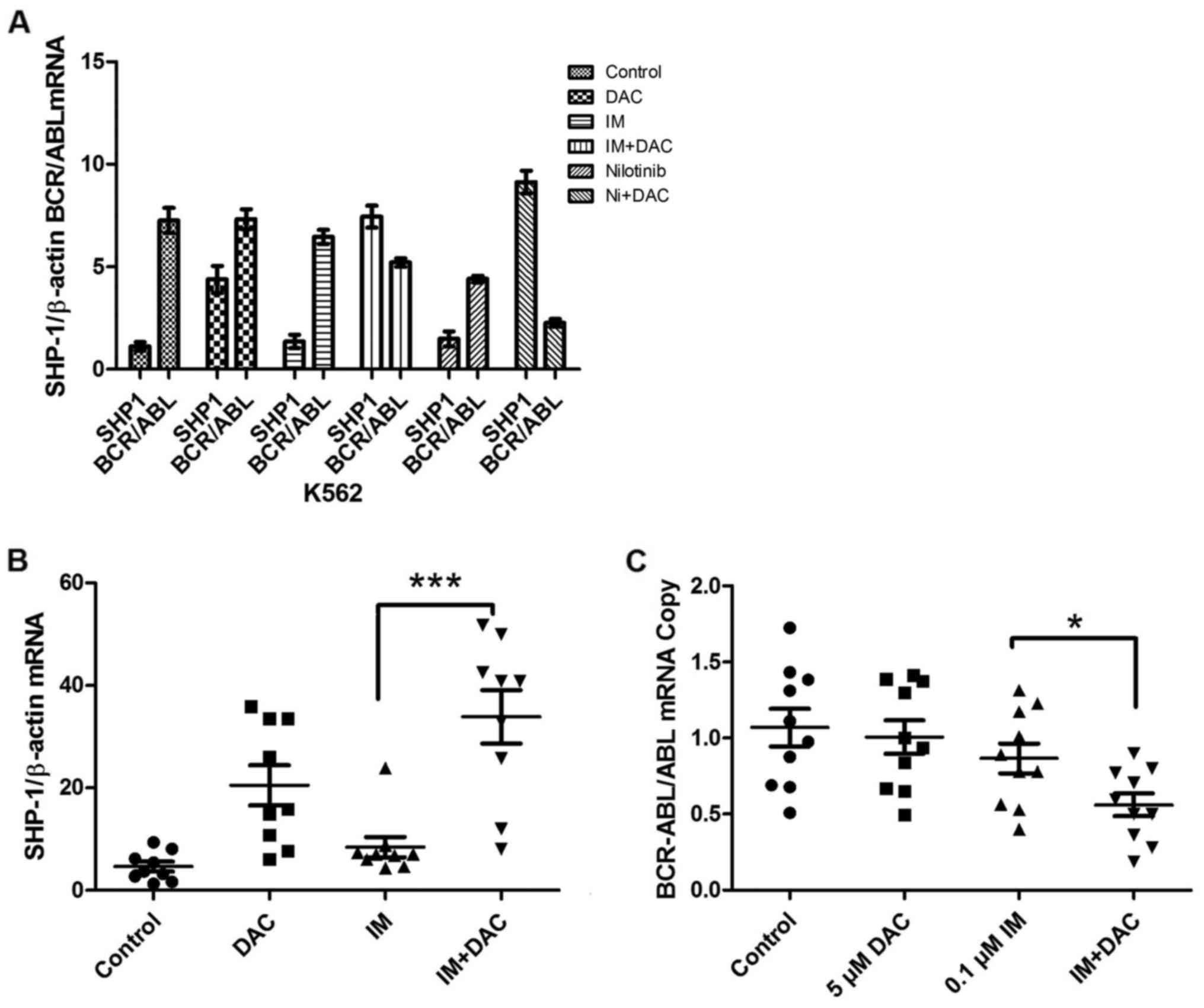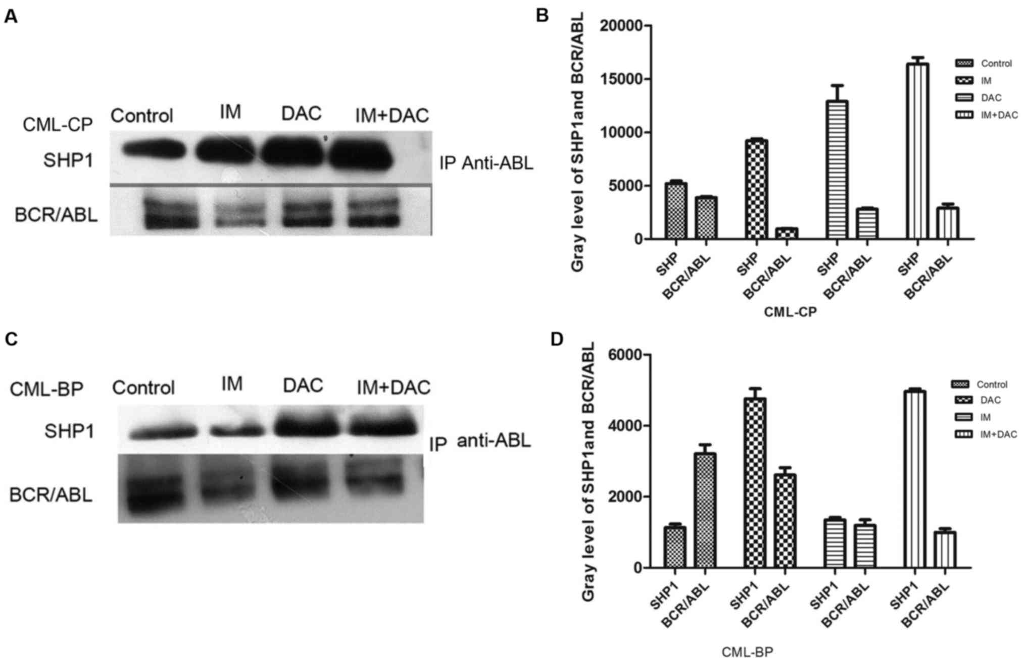 In conclusion: i) DAC was demonstrated to inhibit the proliferation of K562 cells in a dose-dependent manner. ii) IM+DAC and nilotinib+DAC exhibited high synergy. iii) Immunoprecipitation demonstrated that SHP-1 and BCR-ABL (p210) proteins form a complex in K562 cells and in the primary cells derived from patients with CML, suggesting there is an interaction between SHP-1 and BCR-ABL (p210) protein. Therefore, SHP-1 may be considered a tyrosine phosphatase that controls the activity of BCR-ABL (p210) tyrosine kinase. SHP-1 expression was identified to be decreased in K562 cells and CML-BP primary cells compared with the expression in CML-CP primary cells, suggesting that it is also associated with CML disease progression. iv) SHP-1 mRNA and protein expression increased in the combined groups (IM+DAC/nilotinib+DAC) compared with the monotherapy groups, while BCR-ABL expression decreased. Methylation of SHP-1 was observed in K562 cells, although it was not identified in the IM+DAC therapy group. Hence, it is suggested that DAC recovers SHP-1 expression through demethylation, thereby enhancing the therapeutic effect of TKIs. The results of the present study suggest that DAC combined with TKIs provide a novel strategy for managing TKI tolerance and the progression of CML in patients.