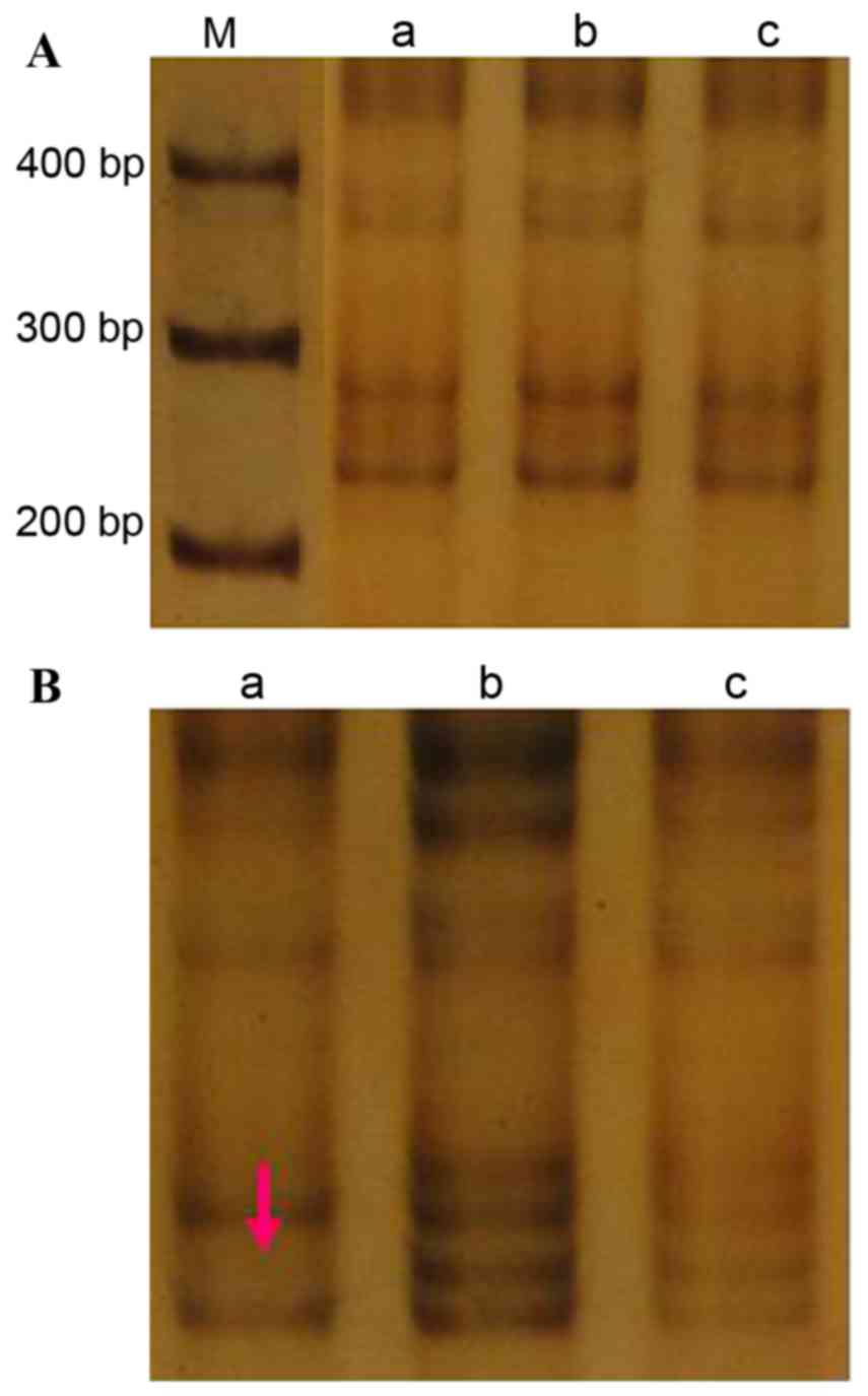 The PCR products were run on a 6% polyacrylamide gel at 550V for 2.5 h. Following electrophoresis, the gel was fixed with 10% ethyl alcohol for 10 min at room temperature. The gel was oxidized with nitric acid for 2 min and stained with silver nitrate solution 15 min at room temperature. Sodium carbonate-formaldehyde solution was added to color the gel 3 times, then the staining reaction was terminated through the addition of acetic acid (10%) at room temperature. If the density of a band was not present or lowered to that that of 50% of normal tissue, it was defined as LOH. If the density of the band was more than that of normal tissue, it was defined as MSI.
