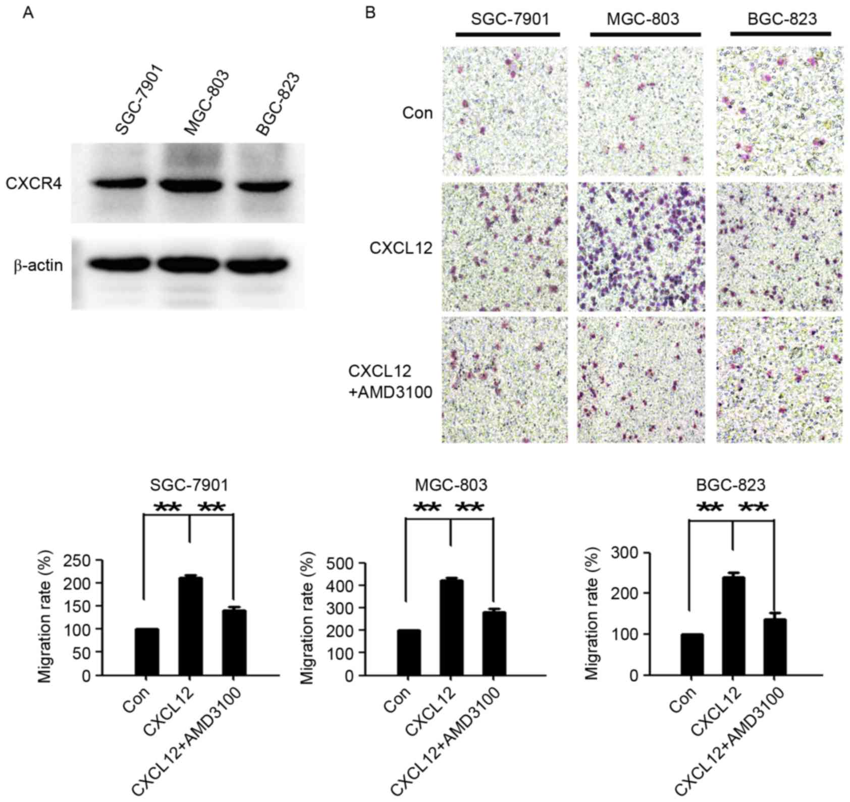 To investigate the role of the CXCL12/CXCR4 axis in gastric cancer cells, western blotting was used to examine the expression of CXCR4 in 3 gastric cancer cell lines (SGC-7901, MGC-803 and BGC-823). As presented in Fig. 1A, all 3 gastric cancer cell lines expressed CXCR4. Compared with the untreated cells, CXCL12 evidently induced gastric cancer cell migration. AMD3100, a highly specific chemokine receptor CXCR4 antagonist (25), significantly reduced CXCL12-induced cell migration (Fig. 1B). These data demonstrated that the CXCL12/CXCR4 axis performs an important role in the migration of gastric cancer cells.