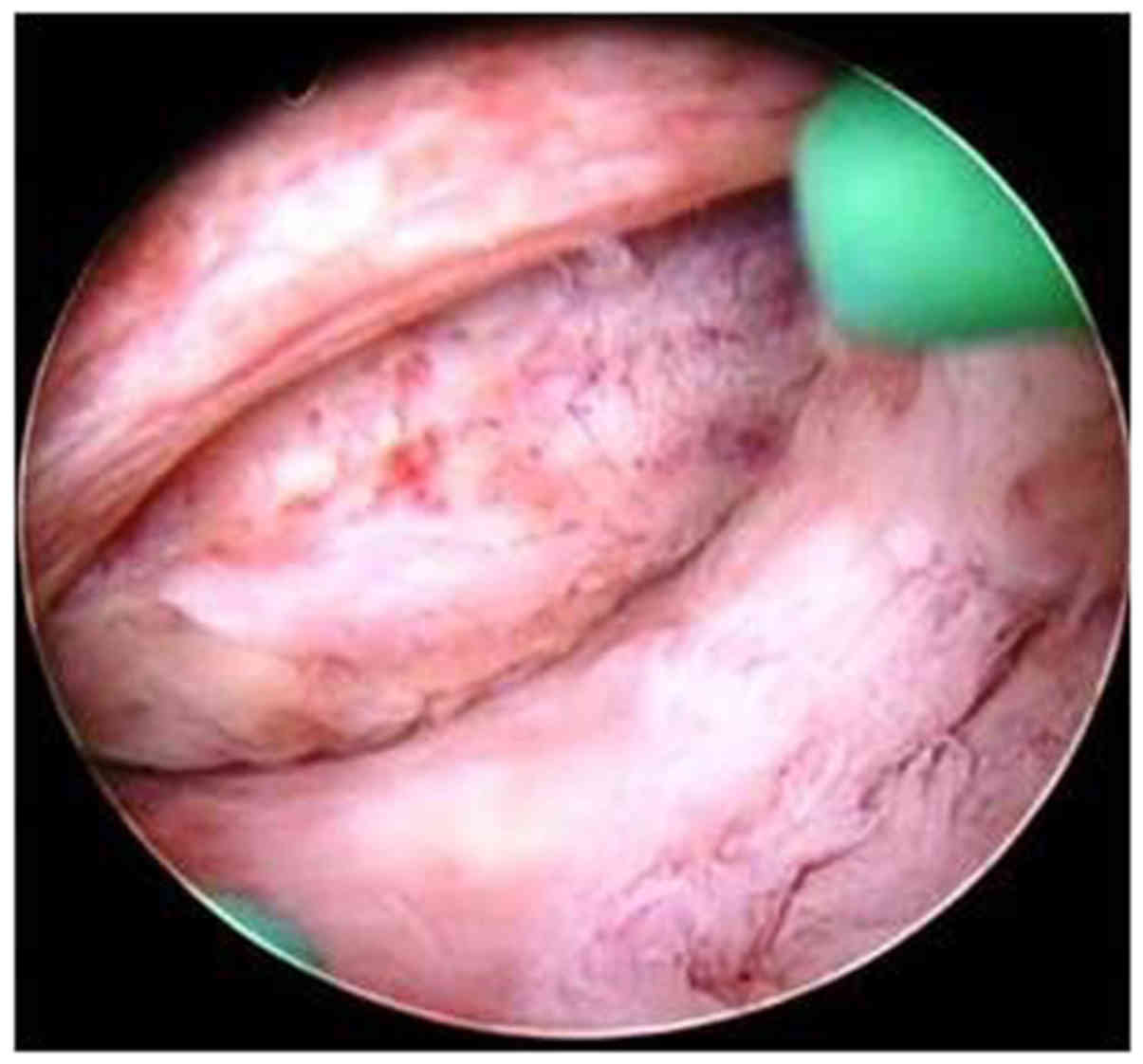 A diagnostic work-up was initiated to detect possible causes of vaginal bleeding. She underwent transvaginal ultrasound, which revealed endometrial thickening (9 mm). Magnetic resonance imaging (MRI) revealed a thickened endometrial myometrium (16×32 mm) with multicystic tumors (Fig. 1). A hysteroscopic examination revealed an endometrial polyp in the uterine cavity, which was resected (Fig. 2). A pathological examination, including hematoxylin-eosin staining and immunohistochemical staining, was performed (Fig. 3). The acquisition of tumor tissues of the patients was approved by the Shimane University Institutional Review Board. Hematoxylin and eosin revealed the absence of solid, alveolar, papillary, or gland-forming units. The tumor cells were arranged in slender linear strands, one to two cells in thickness. The tumor cells may have been dispersed in an irregular fashion in a densely fibrotic stroma. Results of immunohistochemical staining for estrogen receptor, progesterone receptor, and HER2 were positive, whereas those for E-cadherin were negative. The morphology, along with the immunohistochemical findings and the clinical history, supported the diagnosis of lobular breast carcinoma metastatic to the endometrial polyp.