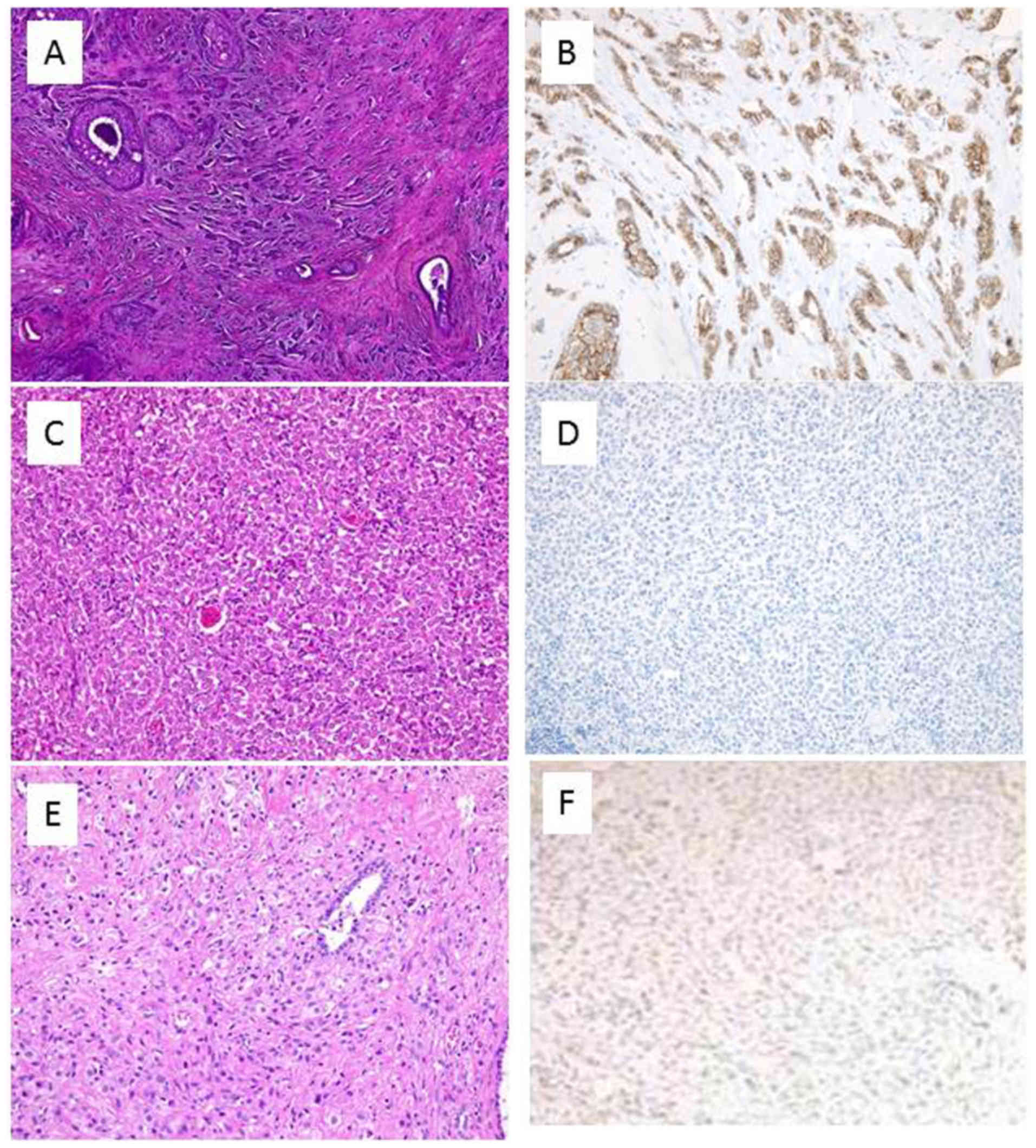 Liebmann RD, Jones KD, Hamid R and Lapsley M: Fortuitous diagnosis in a uterine leiomyoma of metastatic lobular carcinoma of the breast. Histopathology. 32:577–578. 1998. View Article : Google Scholar : PubMed/NCBI | |