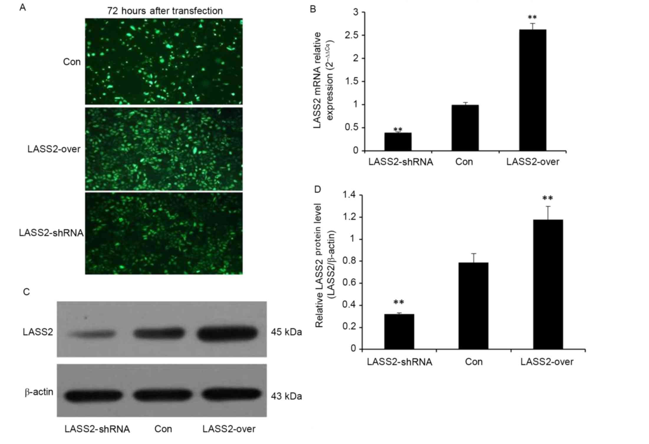 EJ-M3 cells were transfected with a LASS2 shRNA plasmid (cat no. HSH008629-CU6) or a LASS2 overexpression plasmid (cat no. EX-T3019-M98-5) (both GeneCopoeia, Inc., Rockville, MD, USA). Briefly, the plasmids were amplified in DH5α Escherichia coli cells (Takara Biotechnology Co., Ltd., Dalian, China), purified using an E.Z.N.A.® Endo-Free Plasmid Mini Kit I (Omega Bio-Tek, Inc., Norcross, GA, USA), and transfected into 80% confluent EJ-M3 cells using Lipofectamine® 2000 (Invitrogen; Thermo Fisher Scientific, Inc., Waltham, MA, USA). A lentiviral vector expressing green fluorescent protein (GFP) alone was used as the control. At 72 h following transfection, LASS2 overexpression and LASS2 shRNA positive cells were selected using 1 µg/ml neomycin or puromycin, respectively, and the transfection efficiency was examined by fluorescence microscopy (Olympus BX53; Olympus Corporation, Tokyo, Japan).