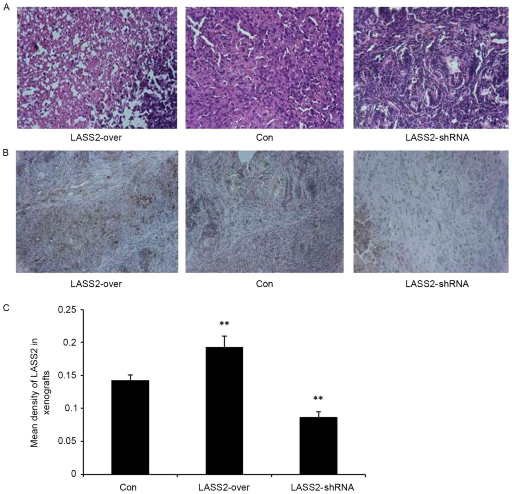 In conclusion, the results from the present study indicate that LASS2 knockdown enhances the heteromorphism of EJ-M3 cell xenograft tumors and promotes the tumorigenicity and growth of tumors in vivo. In addition, LASS2 overexpression was identified to have a tendency to inhibit the growth of xenografts, suggesting that it is a potential therapeutic target for bladder cancer.