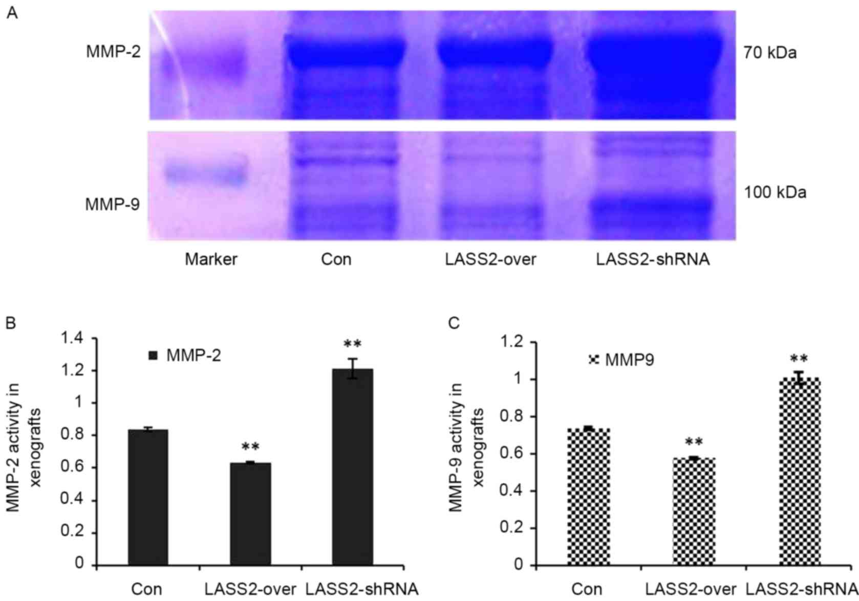 Data from the present study demonstrated that LASS2 overexpression had a tendency to inhibit the growth of xenografts; however, this result was not statistically significant. Previous studies have demonstrated that LASS2 overexpression inhibits tumor growth in vivo; for example, Fan et al (8) demonstrated that the combination of LASS2 overexpression and doxorubicin significantly inhibited the growth of xenografts in nude mice. Additionally, several previous studies have revealed that reducing MMP-2 and MMP-9 activity inhibited tumorigenicity and the growth of xenografts in nude mice. For example, Xu et al (30) reported that the silencing of LASS2 may promote invasion of human prostate cancer cell in vitro by increasing the activity of secreted MMP-2. Consistently, Mei et al (18) reported that the overexpression of LASS2 could inhibit the invasion of the human breast cancer cell line MCF-7 in vitro by suppressing MMP-2 activation and extracellular matrix degradation. In addition, a recent study has revealed that MMP-9 knockdown inhibited tumorigenicity in nude mice (31).