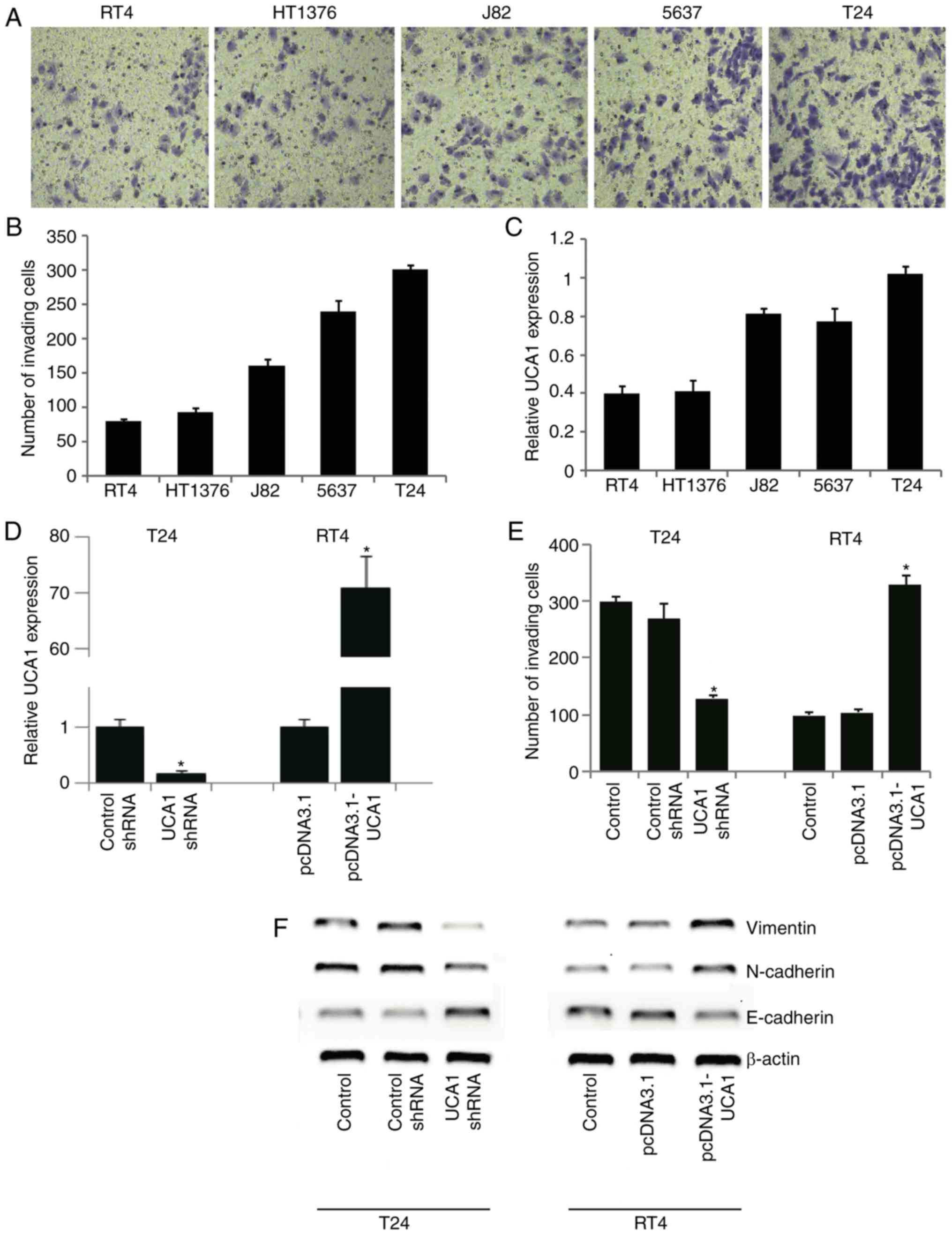 Previous studies revealed that UCA1 expression is associated with enhanced invasion ability of bladder cancer cells (24,36,37). We first investigated the relationship between the expression of UCA1 and the invasion ability of five bladder cancer cell lines. Comparison of Transwell assay results and qRT-PCR analysis of UCA1 expression showed that UCA1 expression was positively correlated with cell invasion ability (Fig. 1A-C). T24 cells showed stronger invasion capability and higher UCA1 expression levels, while RT4 cells showed relatively weaker invasion capability and lower UCA1 expression levels among the five tested bladder cancer cell lines. Knockdown of endogenous UCA1 in T24 cells by siRNA significantly (P<0.05) reduced the number of invading cells, while UCA1 overexpression in RT4 cells increased the number of invading cells significantly (P<0.05) (Fig. 1D and E), suggesting that UCA1 is closely involved in the invasion ability of bladder cancer cells.