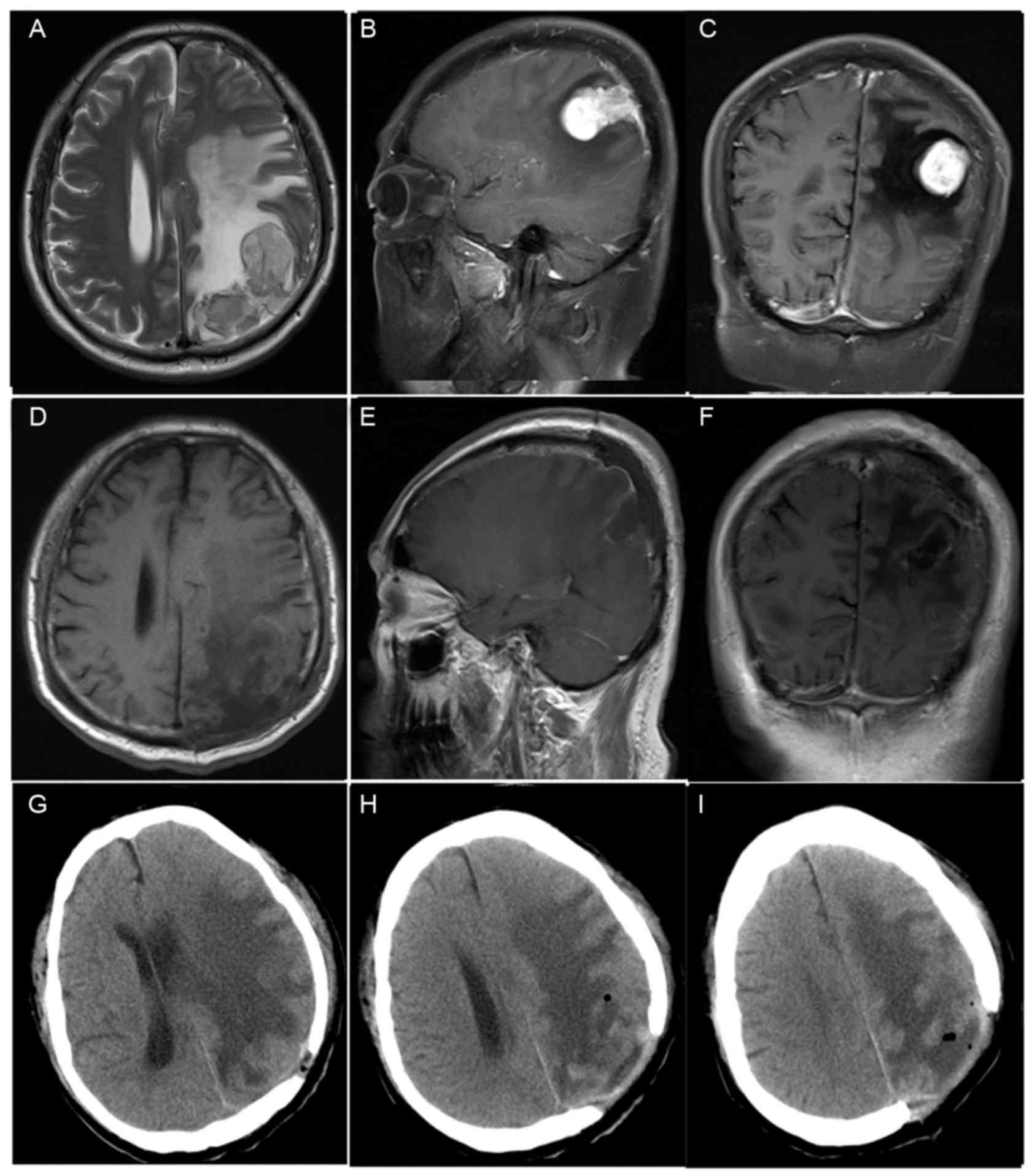 Between November 2008 and March 2015, eight patients with ASPS with brain metastasis underwent surgery at the Department of Neurosurgery of Beijing Tian Tan Hospital (Table I). Patients were identified from the Beijing Tian Tan Hospital registry and all were treated for brain metastatic ASPS in the same hospital. Relevant clinical (including follow-up) data were collected through a chart review and telephone interviews as necessary. The present study also analyzed all available neuroimaging data and radiological reports. Magnetic resonance imaging (MRI) with gadolinium contrast enhancement was performed as standard radiological investigation prior to and following treatment. MR images were evaluated for the predominant signal intensity and homogeneity of the tumor on T1- and T2-weight images. MR images obtained following intravenous gadolinium chelate injection were evaluated for the degree and predominant pattern of contrast enhancement. Tumor size was recorded according to the measurement of the maximum diameter on MRI. Peritumoral brain edema was evaluated by T2-weighted images or fluid-attenuated inversion recovery sequences on MRI. The patients' neurological status was recorded using the Karnofsky Performance Scale (KPS) score (8). All diagnoses were reviewed at the Department of Neuropathology at the Beijing Neurosurgical Institute (Beijing, China) using the 2007 World Health Organization classification of tumors of the central nervous system (9).
