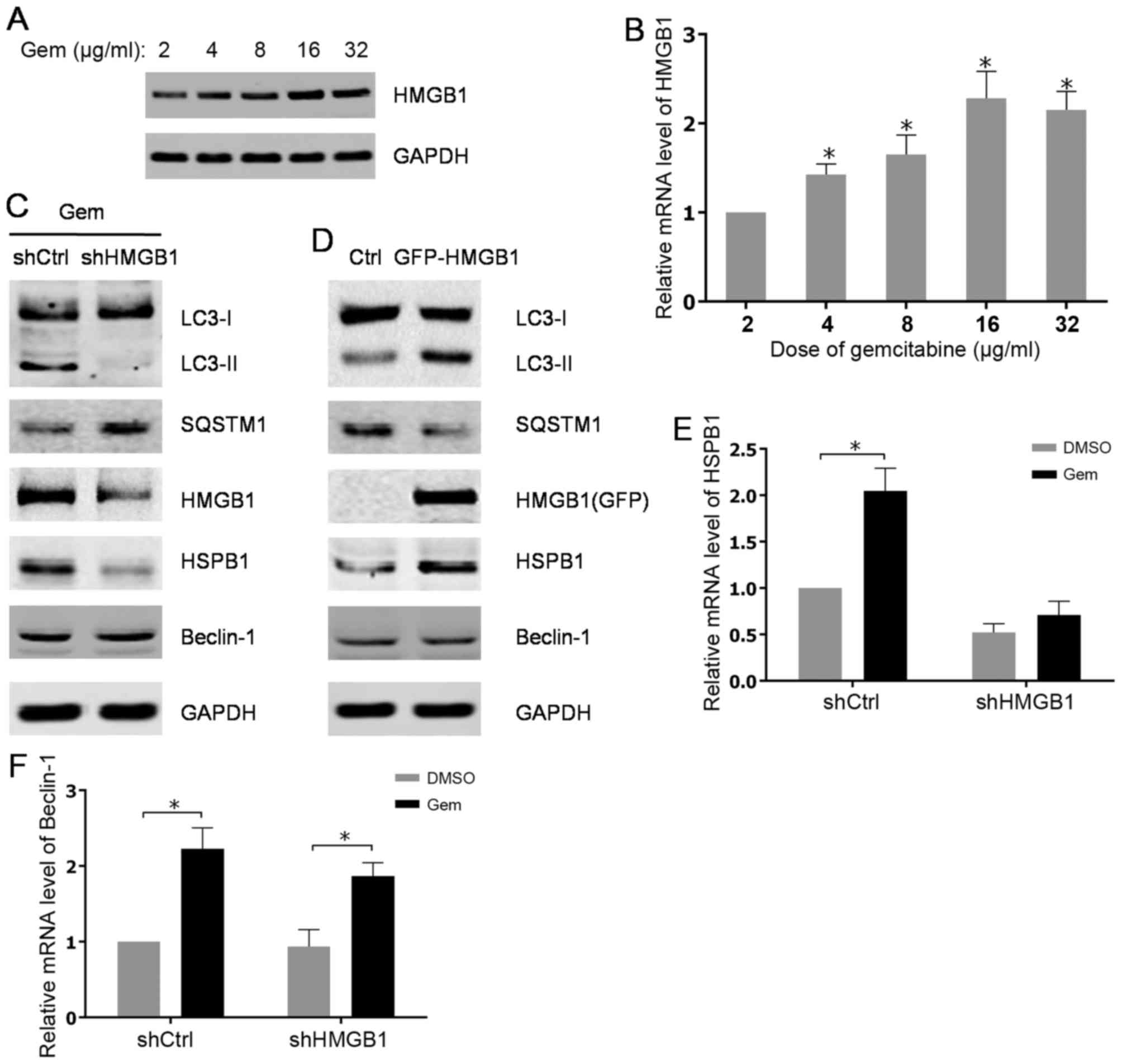 In summary, it was demonstrated that HMGB1 expression is increased in the HIPC PC3 cell line after gemcitabine treatment. Subsequently, the increasing HMGB1 expression causes autophagy and decreases the sensitivity to gemcitabine in HIPC cells. Therefore, the present findings provided a novel mechanism for gemcitabine resistance in HIPC cells, which could be used as a target for the diagnosis and treatment of patients with HIPC.
