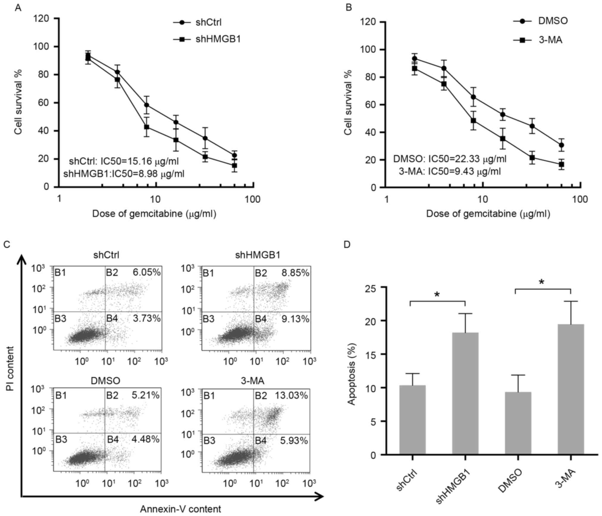 To determine the function of autophagy in response to gemcitabine, the sensitivity to gemcitabine in HIPC cells with different treatments was measured by cell viability assay. The results suggested that elimination of HMGB1 by shRNA in PC3 cells resulted in an apparent reduction of IC50 for gemcitabine treatment (Fig. 3A). Additionally, PC3 cells were either treated with gemcitabine alone or co-treated with gemcitabine and the inhibitor of autophagy 3-MA. The present findings showed that the group treated with only gemcitabine was more resistant to gemcitabine compared to the group that received co-treatment, indicating the protective role of autophagy in HIPC cells exposed to gemcitabine (Fig. 3B). Additionally, consistent with the aforementioned results, inhibition of autophagy in PC3 cells by HMGB1 shRNA or 3-MA-enhanced cell apoptosis induced by gemcitabine (Fig. 3C and D). Therefore, these data elucidated that HMGB1-mediated autophagy reduced the sensitivity of HIPC cells to the drug gemcitabine.