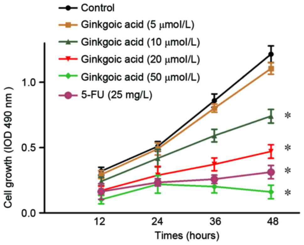 In the present study, the effect of ginkgolic acid on the proliferation of SW480 colon cancer cells was initially investigated. SW480 cells were treated with different concentrations of ginkgolic acid (5, 10, 20 and 50 µmol/l). MTT assays were performed at different time points (12, 24, 36 and 48 h). Cells treated with 0 µmol/l ginkgolic acid were used as the normal control group, and cells treated with 25 mg/l fluorouracil were used as a positive control. The results demonstrated ginkgolic acid treatment inhibited the proliferation of SW480 cells in a concentration- and time-dependent manner; a higher concentration of ginkgolic acid was associated with a greater extent of inhibition (P<0.05 at 10, 20 and 50 µmol/l compared with 0 µmol/l). At 50 µmol/l ginkgolic acid, cell proliferation was almost completely inhibited. Therefore, 10 and 20 µmol/l ginkgolic acid were used for subsequent experiments (Fig. 1).