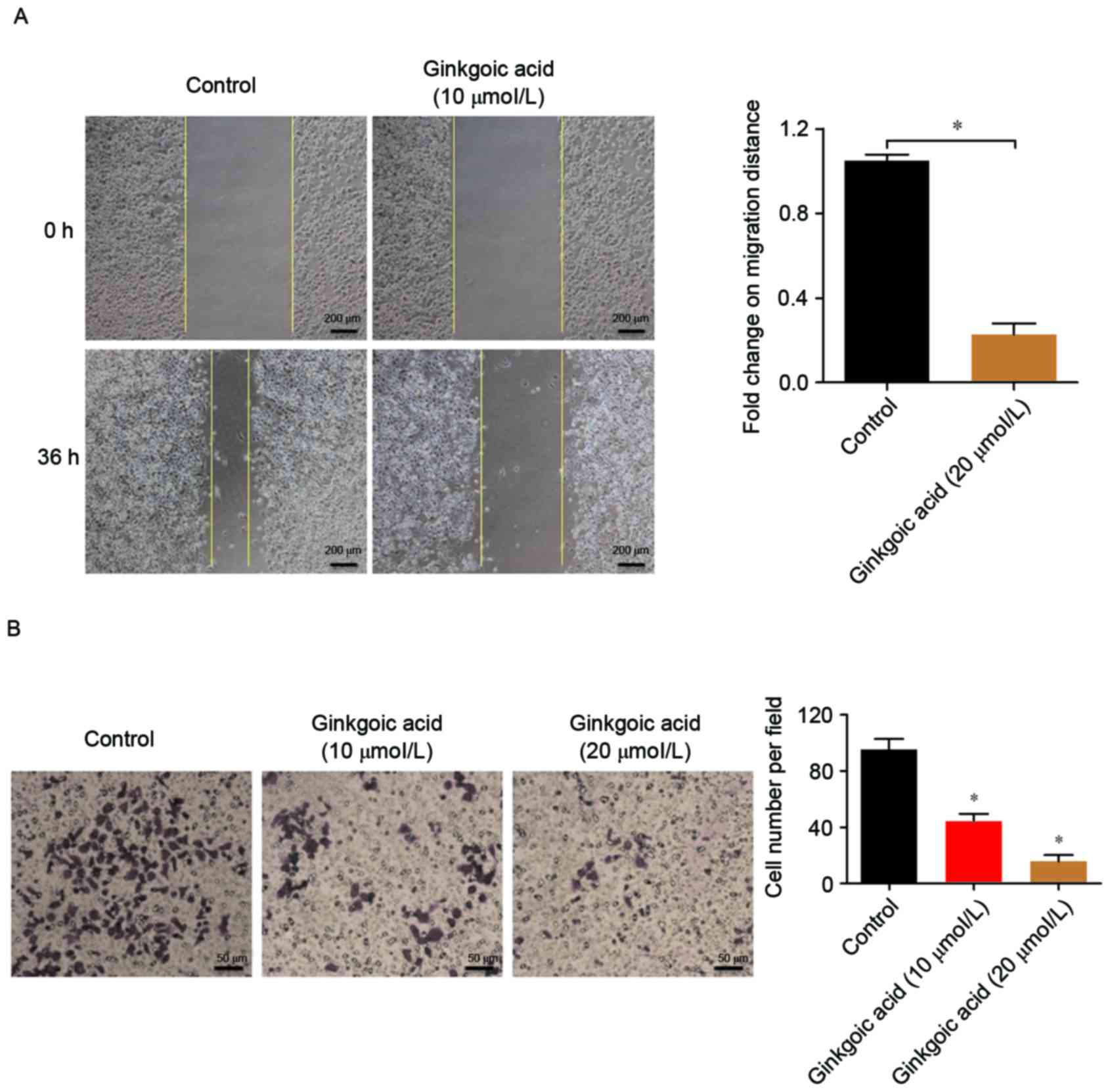 Tumor cell migration and invasion are important processes in the relapse and metastasis of colon cancer. Therefore, the effects of ginkgolic acid on the migration and invasion of SW480 cells were investigated. Wound-healing assays were performed to investigate the effects of ginkgolic acid on the migration ability of SW480 cells. As demonstrated in Fig. 2A, 10 µmol/l ginkgolic acid significantly inhibited the migration of SW480 cells compared with the control group (P<0.05).