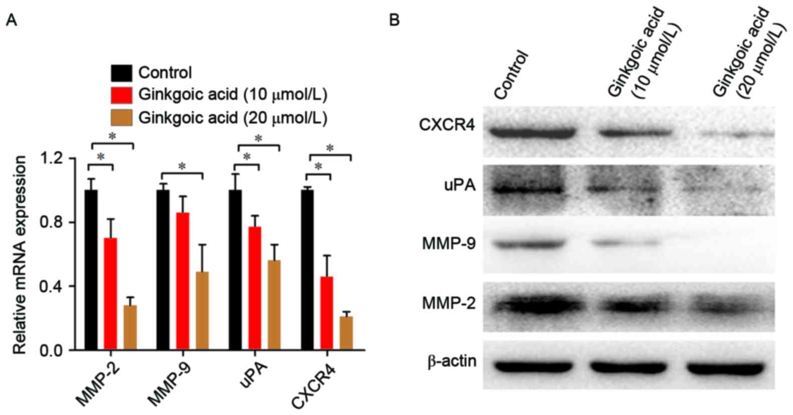 The results of the aforementioned experiments suggest that ginkgolic acid significantly inhibited the proliferation, invasion and migration of SW480 colon cancer cells. Next, the effects of ginkgolic acid on the expression of invasion-associated genes [including matrix metalloproteinase (MMP)-2, MMP-9, urinary-type plasminogen activator (uPA), and C-X-C chemokine receptor type 4 (CXCR4)] in SW480 cells were investigated. SW480 cells were treated with 10 or 20 µmol/l ginkgolic acid for 24 h, and total mRNA was extracted for qPCR. As demonstrated by Fig. 3A, ginkgolic acid treatment significantly reduced the expression of MMP-2 and −9, uPA and CXCR4 mRNA in a concentration-dependent manner (P<0.05). Western blotting results were similar to the qPCR results (Fig. 3B); treatments with 10 and 20 µmol/l ginkgolic acid inhibited the expression of invasion-associated proteins, including MMP-2 and −9, uPA, and CXCR4. These results suggested that ginkgolic acid downregulated the expression of invasion-associated molecules in SW480 cells at transcriptional and post-transcriptional levels.
