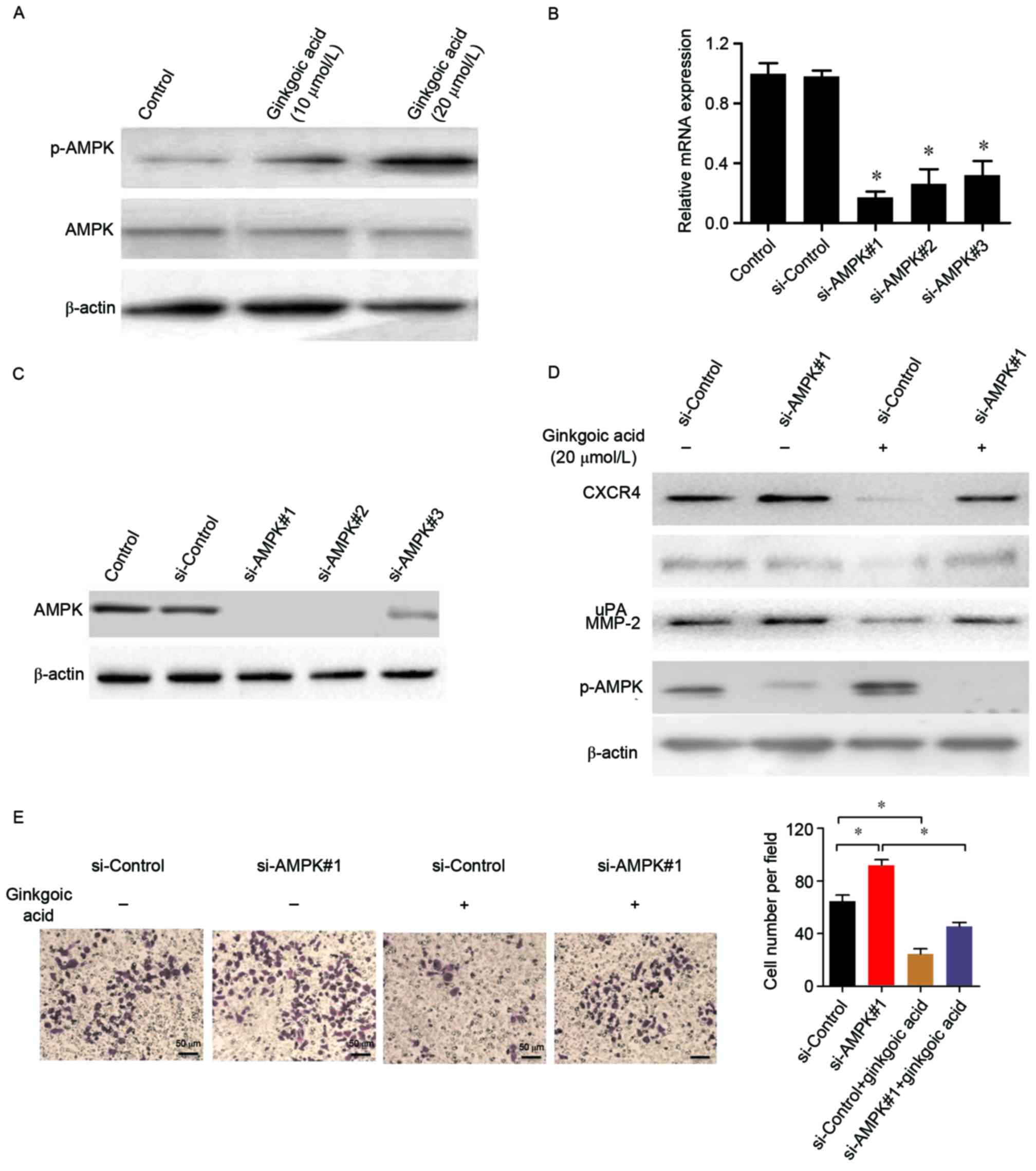 A previous study indicated that inducing AMPK activation may be an important mechanism for the antitumor effects of ginkgolic acid (1). Therefore, the effect of ginkgolic acid on AMPK expression and activation in SW480 cells was investigated. Fig. 4A demonstrates that ginkgolic acid exhibited no significant effect on AMPK protein expression in SW480 cells; however, ginkgolic acid significantly increased the expression of phosphorylated AMPK (p-AMPK), suggesting that ginkgolic acid induced AMPK activation in SW480 cells. To investigate whether AMPK mediated the downregulation of invasion-associated molecules by ginkgolic acid in SW480 colon cancer cells, AMPK-targeting siRNAs were designed and verified by qPCR and western blotting. Fig. 4B and C indicate that all three siRNAs silenced AMPK expression at the mRNA and protein levels, particularly si-AMPK#1. Therefore, following AMPK silencing with si-AMPK#1, SW480 colon cancer cells were treated with ginkgolic acid for 48 h and western blotting was performed to detect the expression of invasion-associated proteins. Fig. 4D demonstrates that AMPK knockdown alone exhibited no significant effect on the expression of MMP-2, uPA, or CXCR4 in SW480 cells; however, it removed the inhibitory effect of ginkgolic acid on the expression of MMP-2, uPA, and CXCR4.