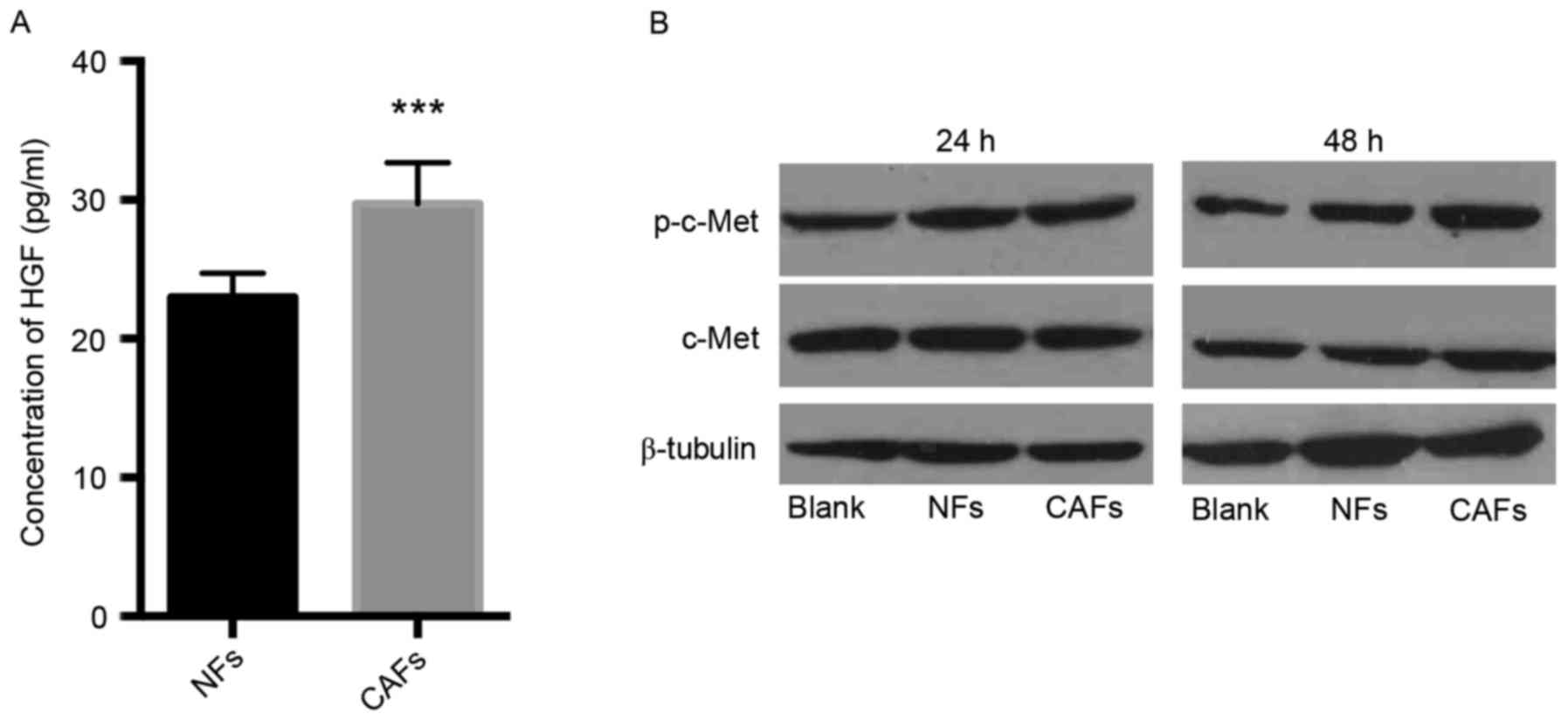 To evaluate the expression of c-Met and its phosphorylated derivative p-c-Met in HLECs co-cultured with CAFs or NFs, western blot analysis was performed to identify the expression of c-Met and p-c-Met following 24 and 48 h culture. Co-cultured with CAFs for 48 h, levels of p-c-Met in HLECs were markedly higher than with NFs (Fig. 1B). These data indicate that substances secreted by CAFs promoted the expression of p-c-Met of HLECs. Thus, CAFs may serve an important role in lymphangiogenesis.