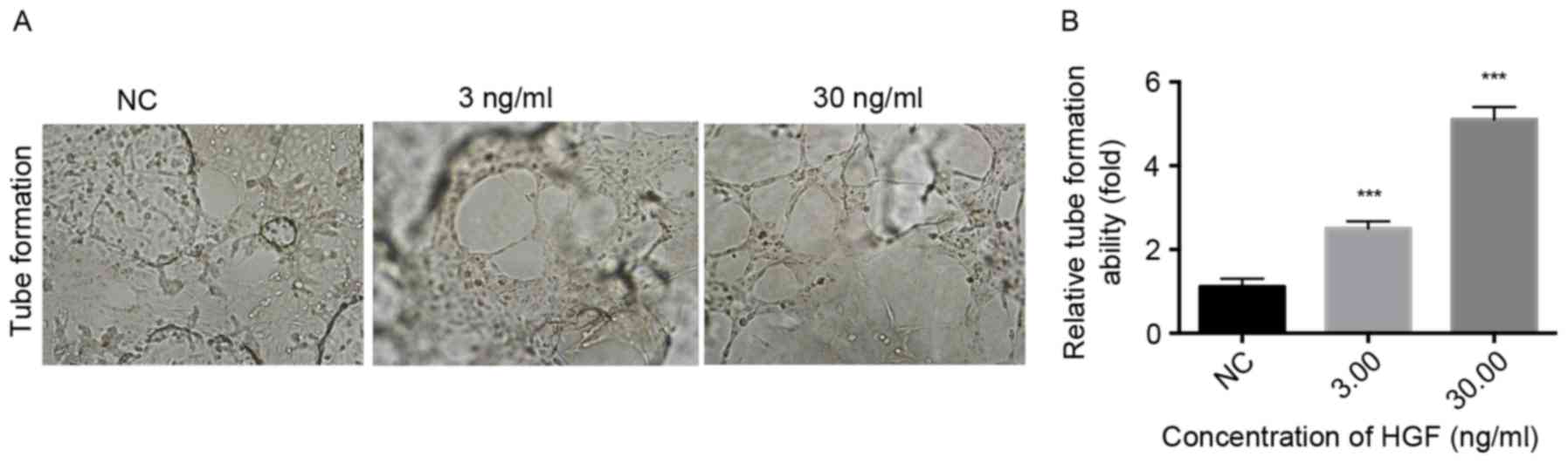 To determine the regulatory role of HGF on HLECs, HLECs were treated with increasing concentrations of rhHGF and the proliferation, migration, invasion and tube formation of HLECs was subsequently evaluated. A significant dose-dependent difference was observed in the proliferation of HLECs that were treated with rhHGF (1.5625–200 ng/ml) for 12 and 24 h compared with the NC (P<0.05; Fig. 2A). The HLECs were induced by 0, 0.3, 3.0 and 30 ng/ml rhHGF. The number of migrating and invading cells significantly increased in a dose-dependent manner following treatment with rhHGF (P<0.001; Fig. 2B and C), indicating that rhHGF promotes the migration and invasion of HLECs. Furthermore, following stimulation with 3.0 and 30 ng/ml rhHGF, HLECs exhibited a significantly higher number of tube formation compared with the NC group (P<0.001; Fig. 3), indicating that rhHGF is involved in the tube formation of HLECs. Taken together, HGF serves a critical role in modulating the CAFs-associated proliferation, invasion, migration and tube formation of HLECs.