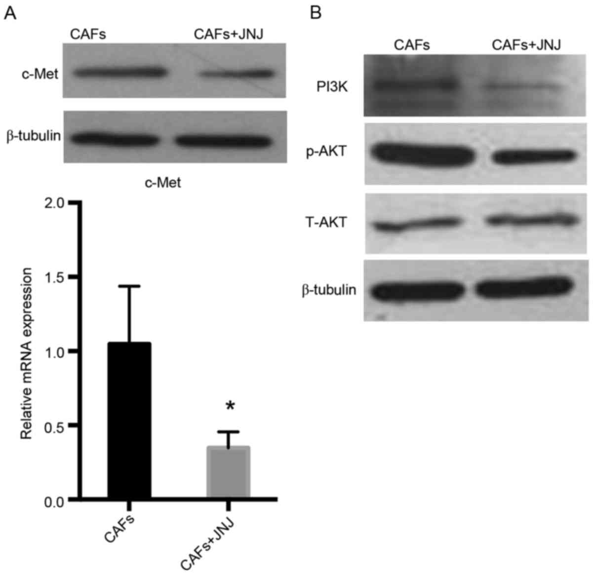 To identify the molecules or proteins involved in the signaling pathway, HLECs were co-cultured with CAFs supplemented with or without the c-Met inhibitor, JNJ-38877605. JNJ-38877605 reduced c-Met mRNA compared with the control group (P<0.05) and markedly downregulated c-Met protein level (Fig. 5A). In addition, western blot analysis indicated that PI3K and p-AKT was also downregulated (Fig. 5B). These data indicate that c-Met/PI3K/AKT may regulate CAF-mediated lymphangiogenesis in the TME of OSCC.