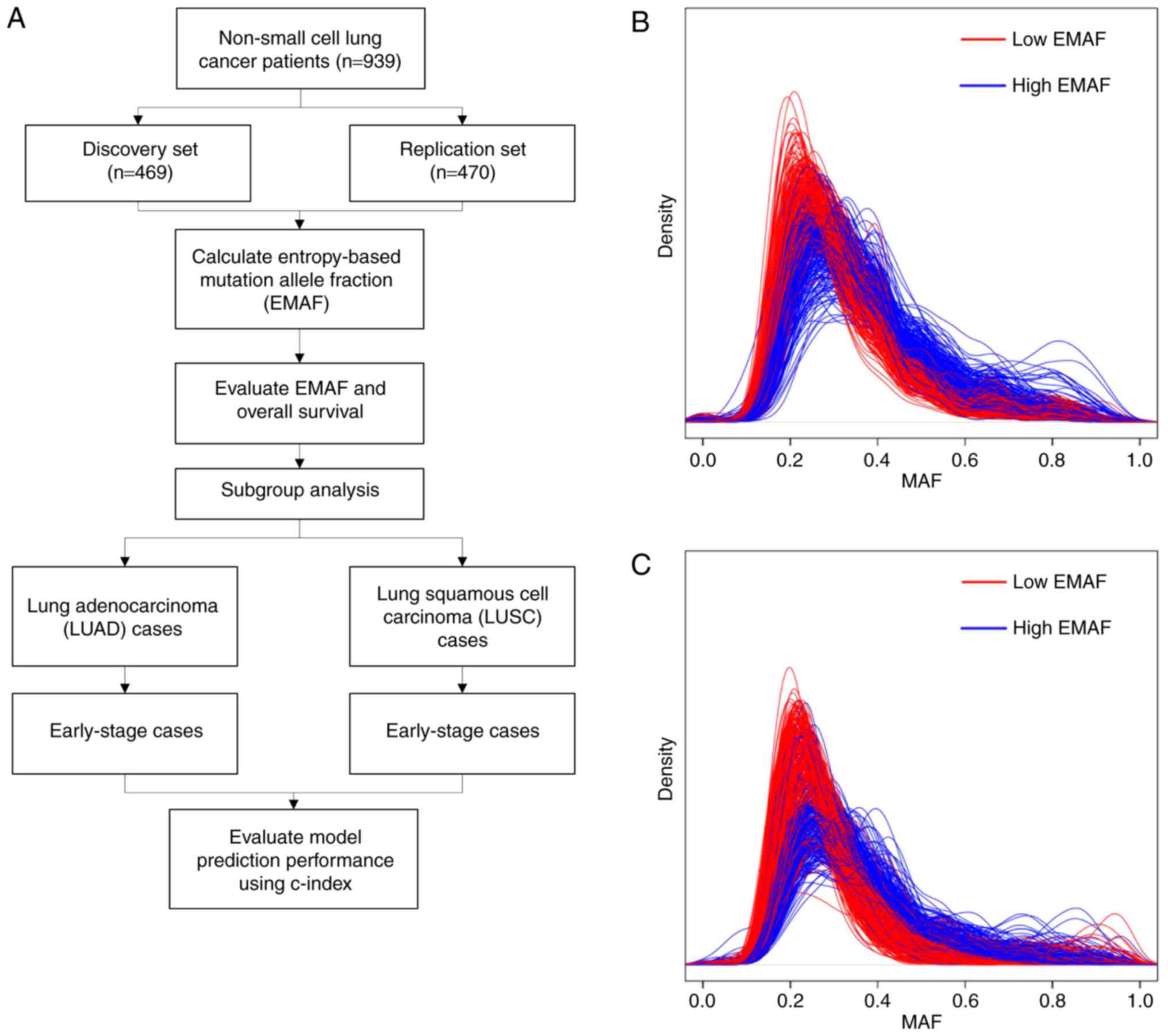 In conclusion, the proposed entropy-based EMAF score can quantify MAF heterogeneity in NSCLC cases and is therefore suggested as a prognostic biomarker. In addition, EMAF differentiates a subgroup of early stage patents with an unfavorable prognosis, potentially providing clinical support for therapeutic decision-making.