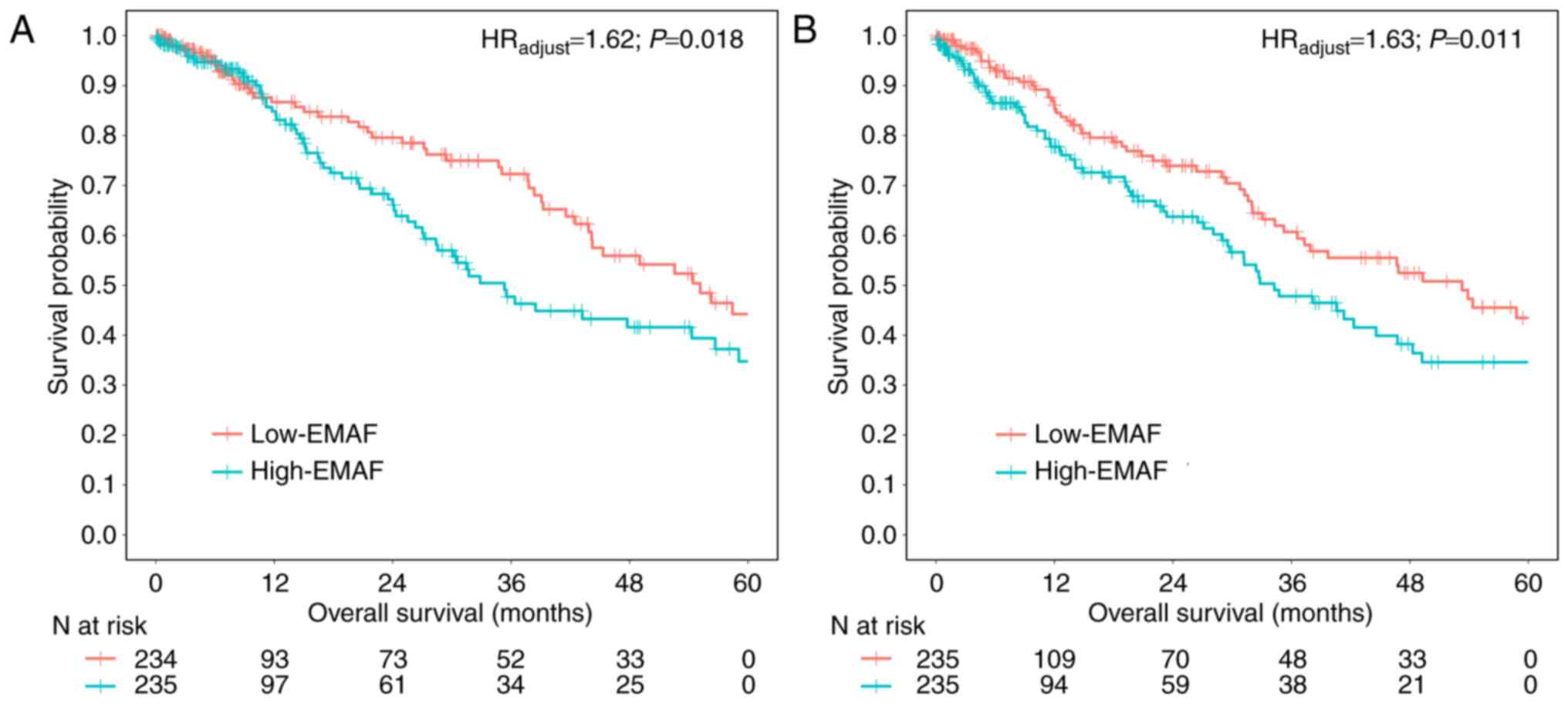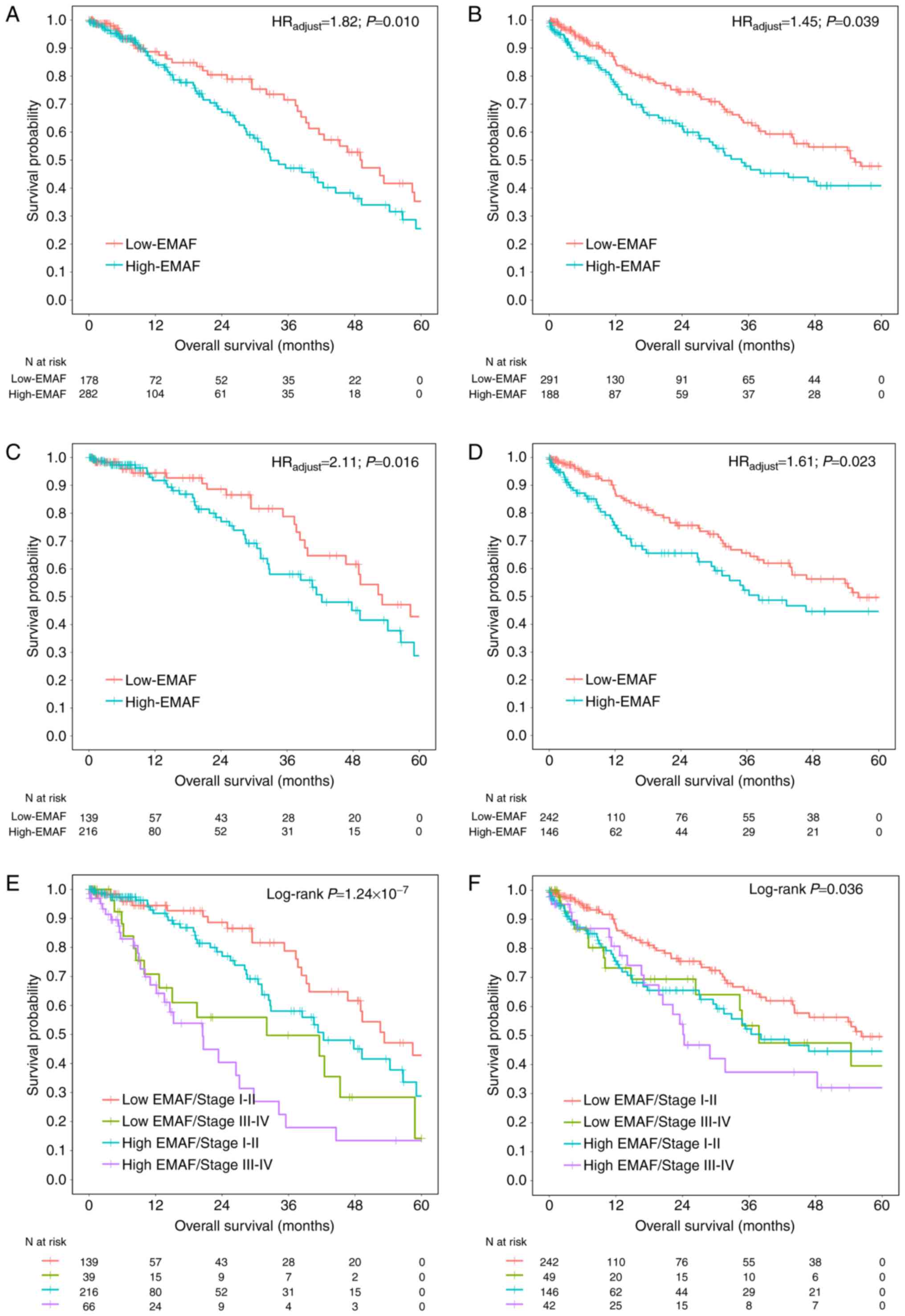 Further, we explored the relationship between EMAF and survival with different histology type. After adjustment for age, gender, smoking status, clinical stage, T classification, N classification, EMAF showed significance in both LUAD (HR=1.82; 95% CI: 1.15–2.87; P=0.010) and LUSC (HR=1.45; 95% CI: 1.02–2.05; P=0.039) cases (Fig. 3A and B).