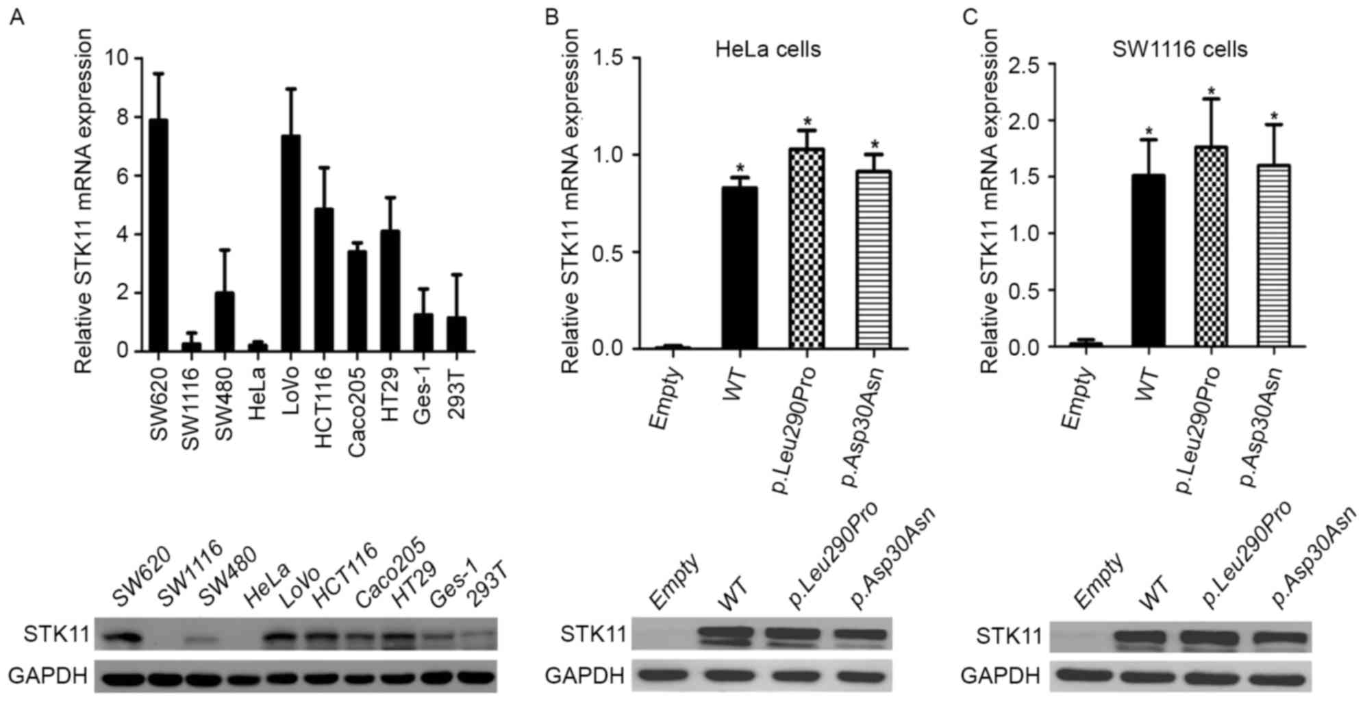 RT-qPCR and western blotting were used to detect endogenous expression levels of STK11 in human cell lines. As shown in Fig. 3A, STK11 expression levels were nearly undetectable in HeLa and SW1116 cells when compared with all other tested cell lines. Subsequently, HeLa and SW1116 cells were used for further studies, and the effects of the novel STK11 mutations were investigated.