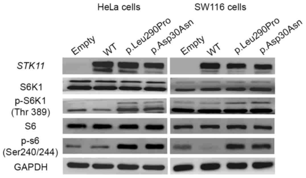 In the present study, STK11 genetic mutations were analyzed from PJS patients in 11 unrelated families, and 8 (72.7%, 8/11) different mutations were found, including 6 point mutations and 2 large deletions. Notably, 3 of the mutations were novel. Of these 3 mutations identified, 2 were missense mutations [c.88G>A (p.Asp30Asn) and c.869T>C (p.Leu290Pro)]. Furthermore, the missense mutations were able to disrupt the function of the tumor suppressor STK11, which led to phosphorylation of S6K1 and S6 and promoted protein synthesis and cell proliferation.