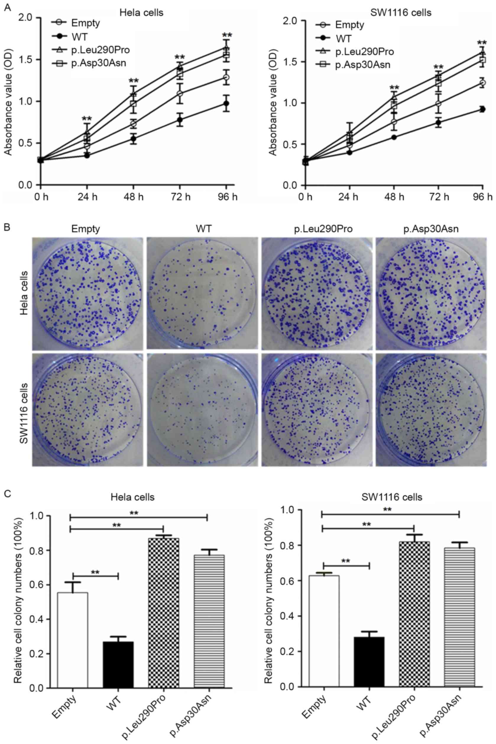 To further determine whether the novel missense STK11 mutations are able to effectively suppress cell growth and proliferation, CCK-8 and colony formation assays were performed. As shown in Fig. 5, HeLa and SW1116 cells transfected with wild-type vectors exhibited a marked reduction in cell growth compared with cells transfected with the STK11 mutant vectors. The growth of HeLa and SW1116 cells transfected with the STK11 mutants (p.Leu290Pro and p.Asp30Asn) was significantly increased (P<0. 01) when compared with the empty vector control (Fig. 5A and C). These results suggest that STK11 gene is a tumor suppressor gene in the two cell lines. The two novel STK11 mutations abrogated cellular growth suppression function of the STK11 gene, which contributes to tumorigenesis. Furthermore, the effect of the novel STK11 missense mutations on cell apoptosis was investigated. Compared with the empty vector control, the wild-type vector promoted apoptosis. However, there was no statistically significant difference between the two novel missense STK11 mutants and the control (data not shown). These findings indicate that although the STK11 gene exerts a role in promoting apoptosis in HeLa and SW1116 cells, the two novel STK11 missense mutations have no significant effect.
