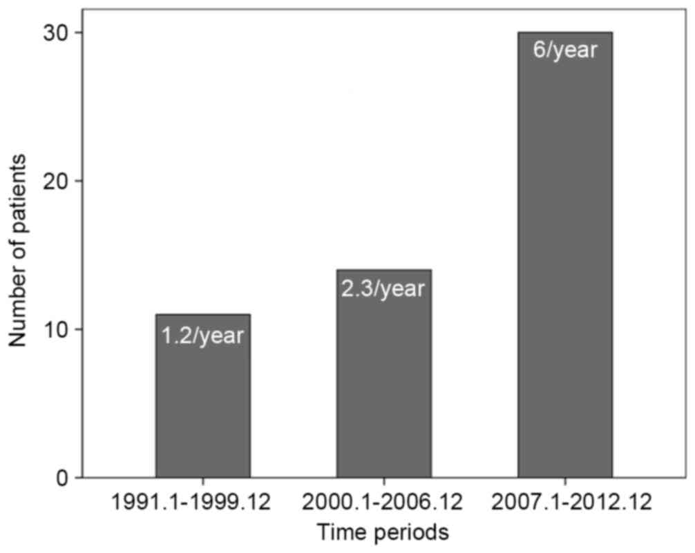 Table II.Alterations in the clinical characteristics of pancreatic mucinous cystic neoplasms, according to the time of surgery. |